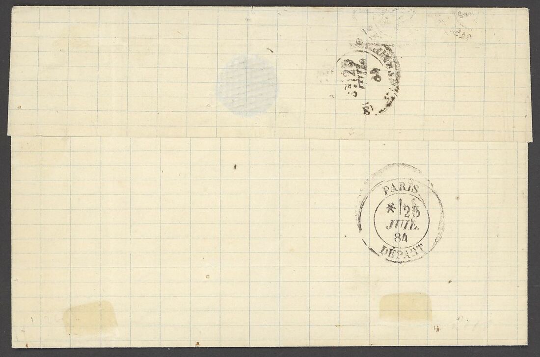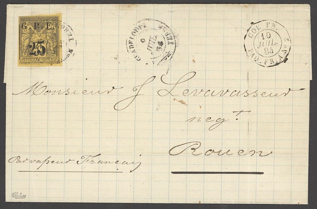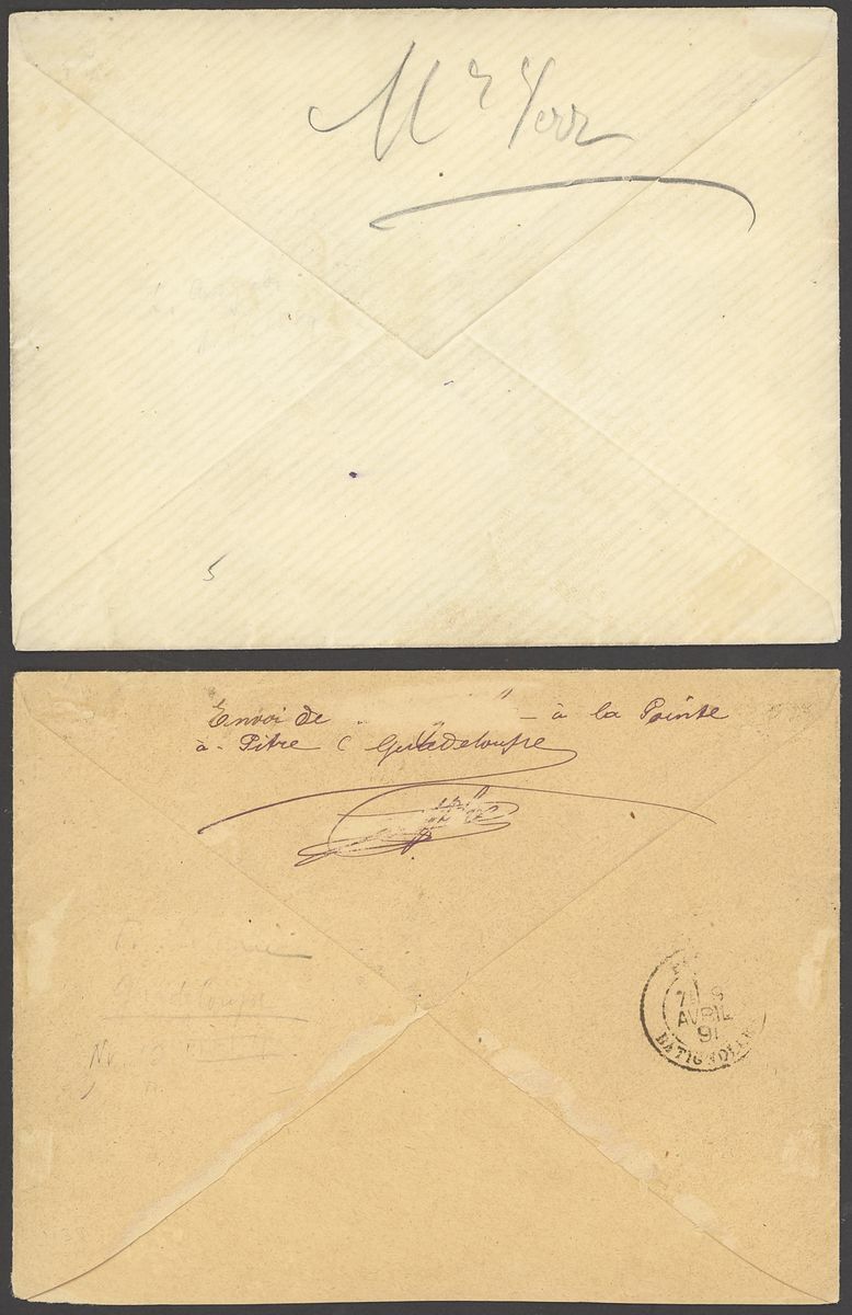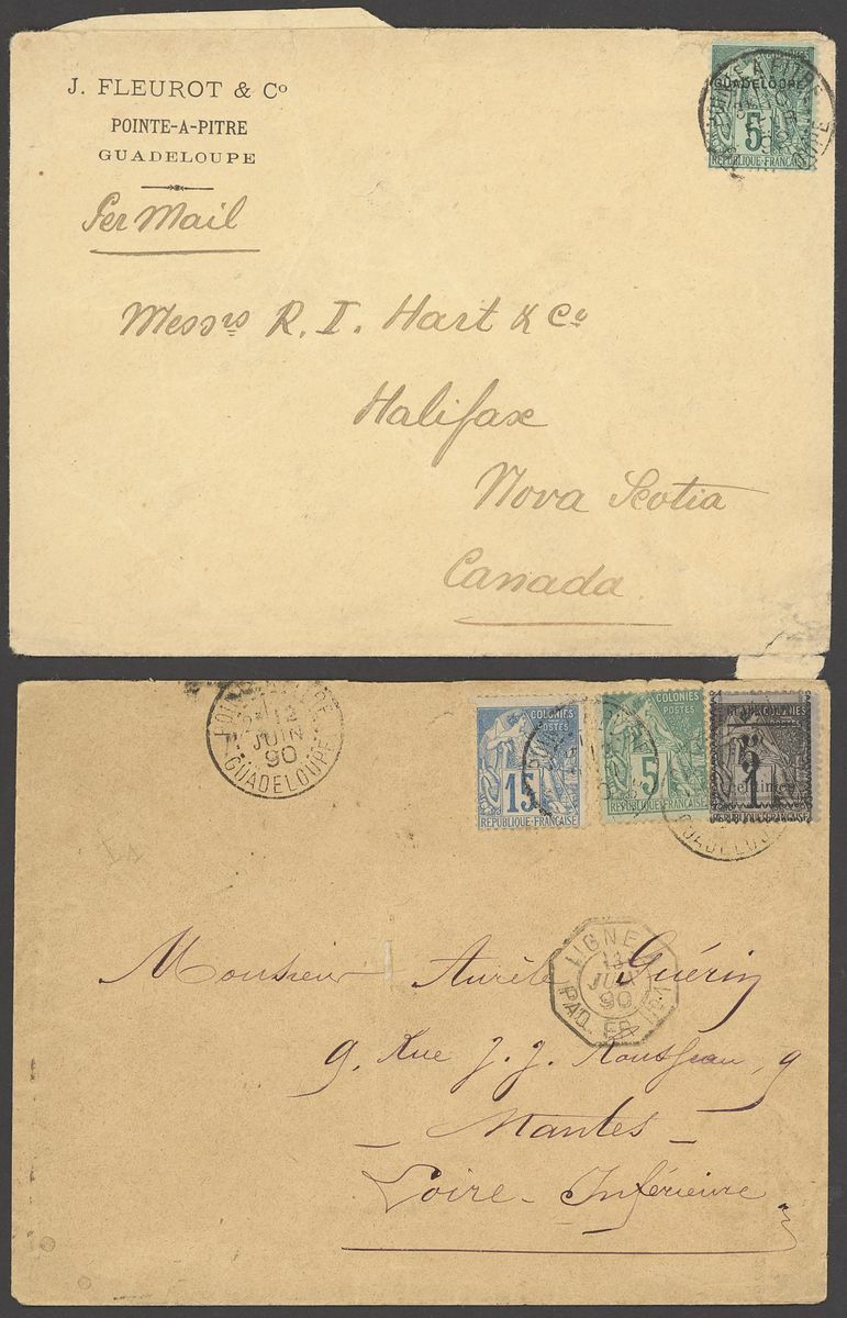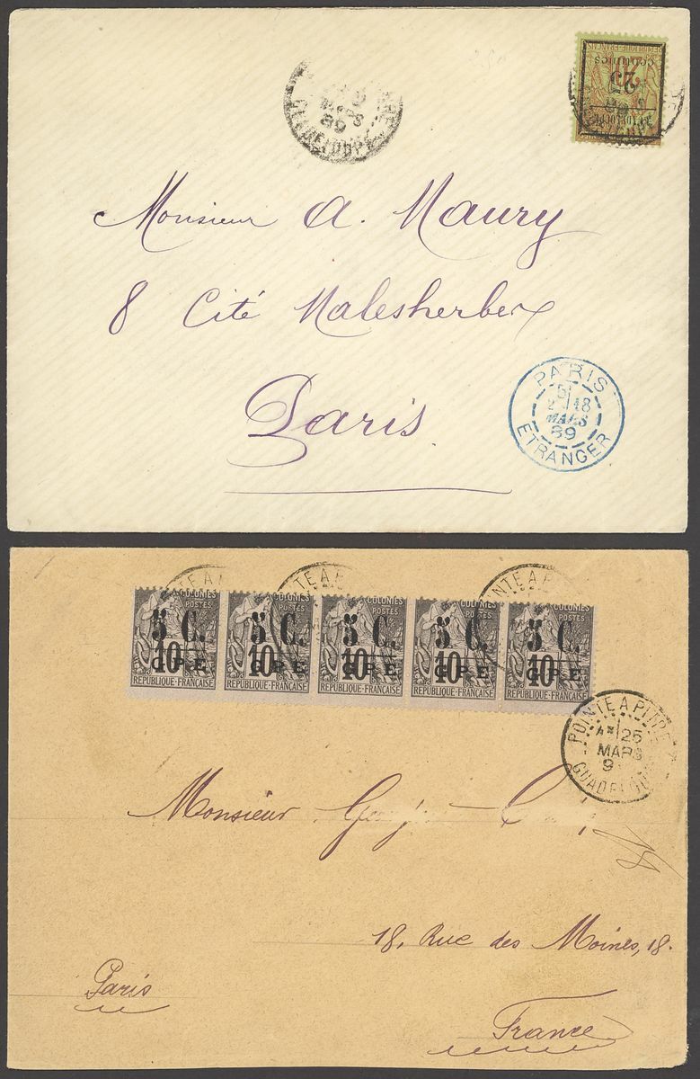 1884-1892 postal history selection (5) including 1884 (9 July) entire letter to Rouen, marked "Par Vapeur Francaise", bearing 1884 "25" on 35c. (large "5" variety), clear to large margins, Guadeloupe/Basse Terre cancellation and with octagonal Col. Fr./Paq.Fr. A. No. 2 alongside, transit and arrival markings on reverse; 1890 (12 June) envelope to Nantes bearing 1889 serrated frame 5c. on 1c., unoverprinted Dubois 5c. and 15c., Pointe a Pitre/Guadeloupe cancellations with octagonal Ligne A/Paq. Fr. No. 1 alongside, arrival datestamp on the reverse.