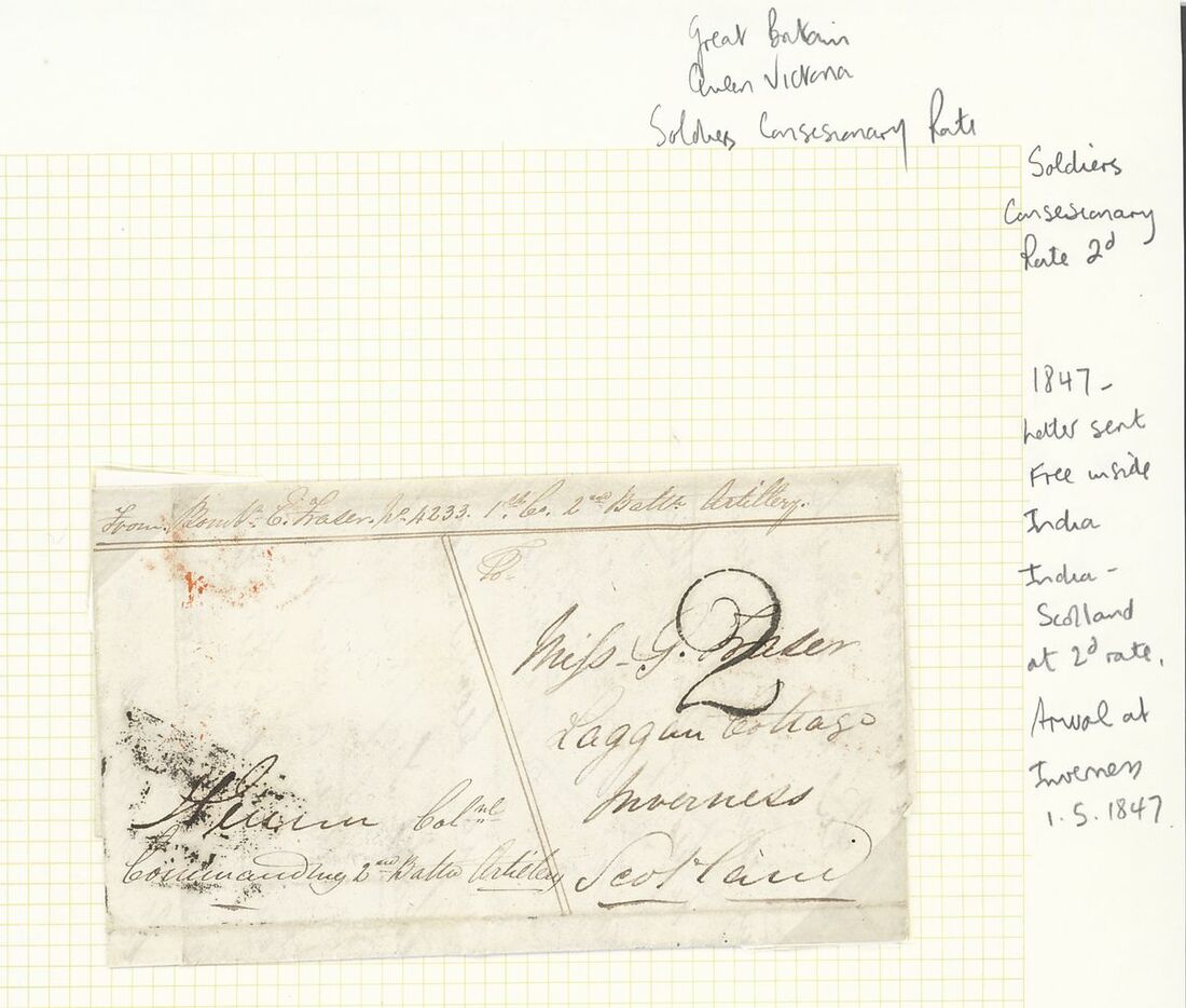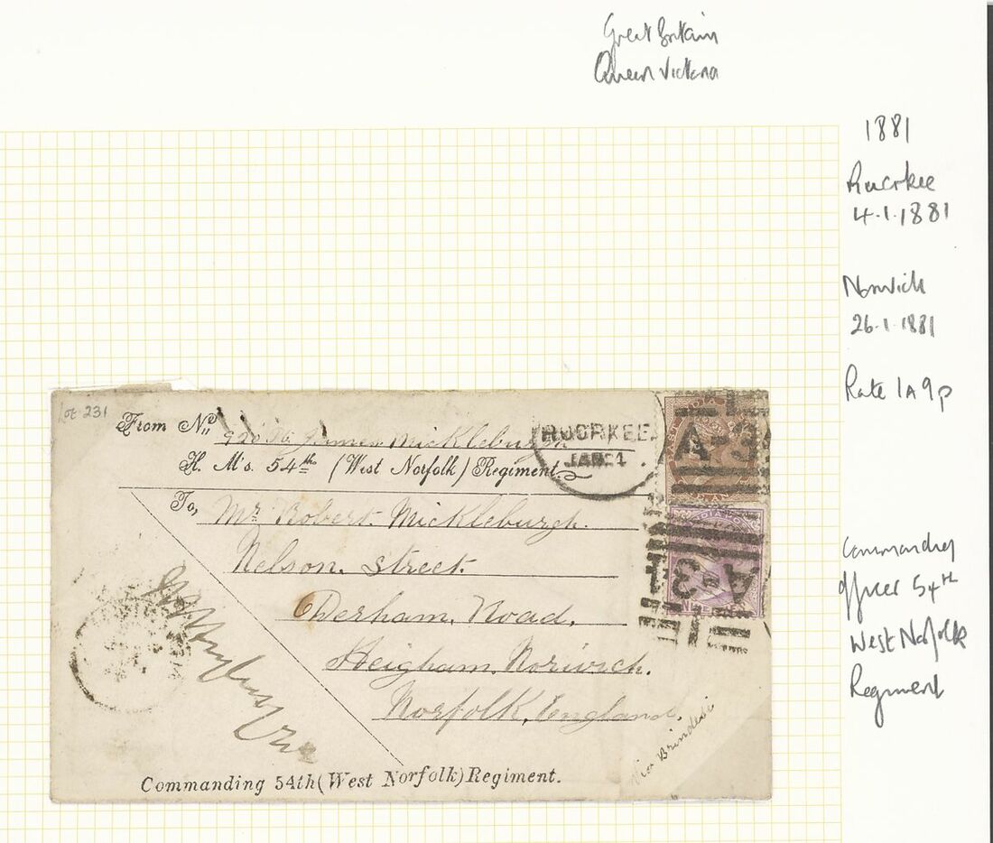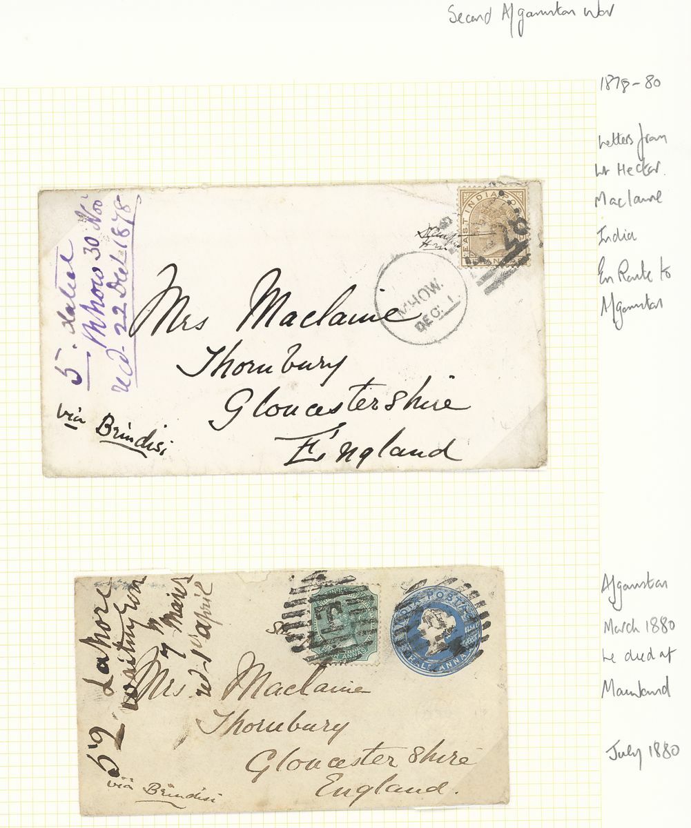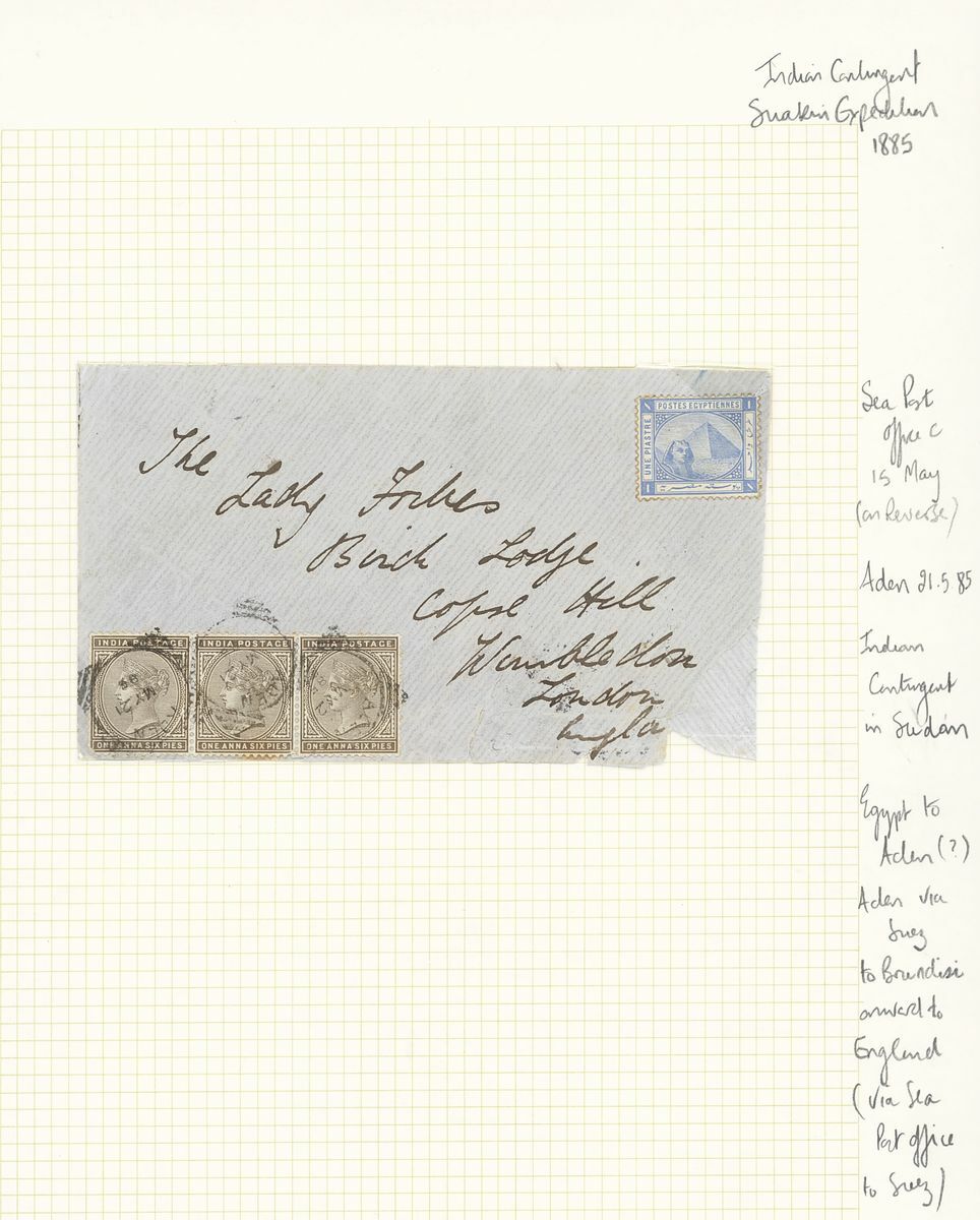 1847-1885 Military postal history selection (5) arranged on annotated pages including 1847 stampless cover to Scotland; 1881 printed "Commanding 54th (West Norfolk) Regiment" envelope to England bearing 1865 1a. and 1874 9p.; 1878 and 1880 two items from the Lt. Mclaine correspondence from the second Afghan War; 1885 Egypt-India combination cover to England from the Suakin Expedition bearing Egypt 1pi. and India 1a.6p. strip of three cancelled in Aden, the reverse with "Sea Post Office" c.d.s. (15.5); mixed condition, a very good lot for the student of the military subject.