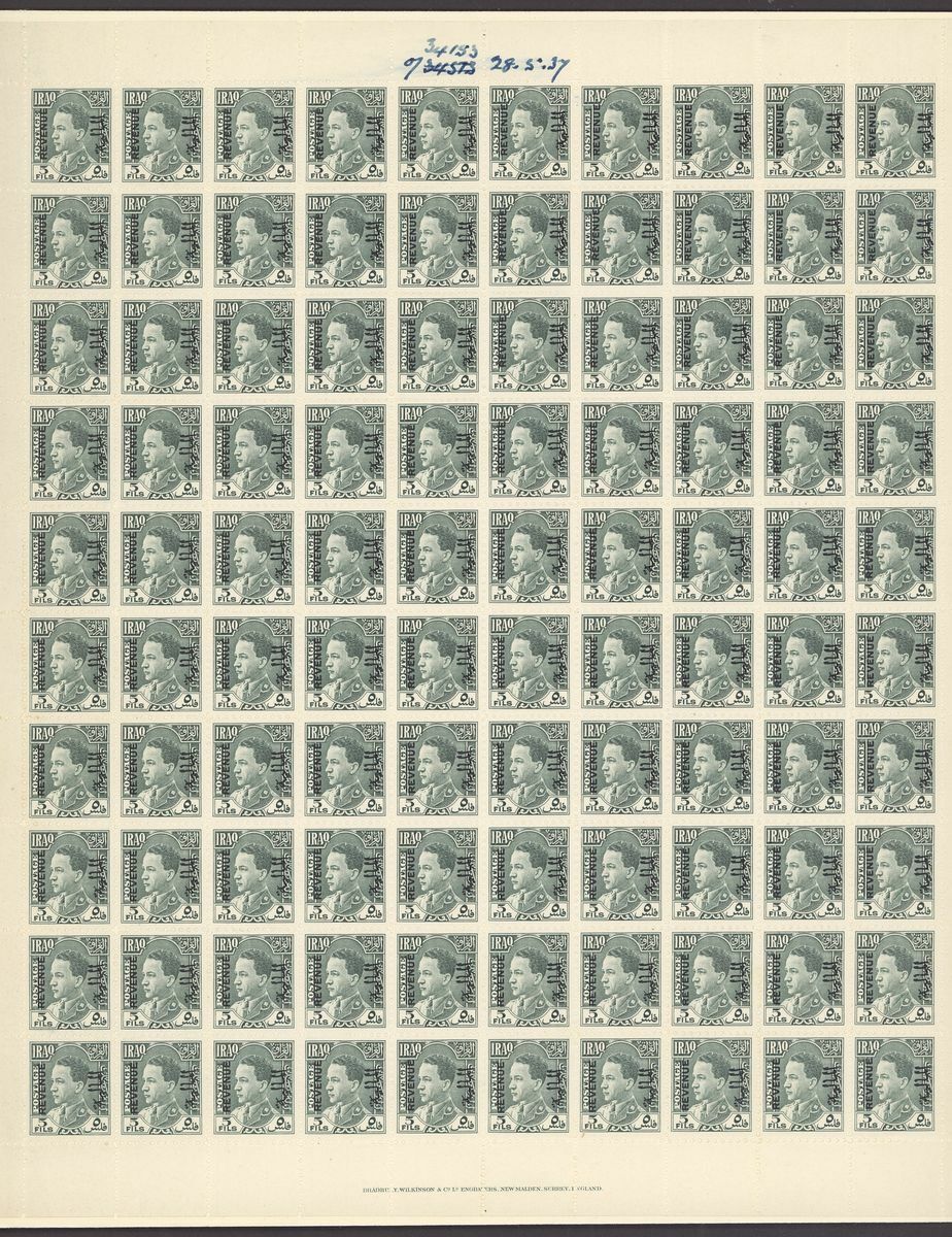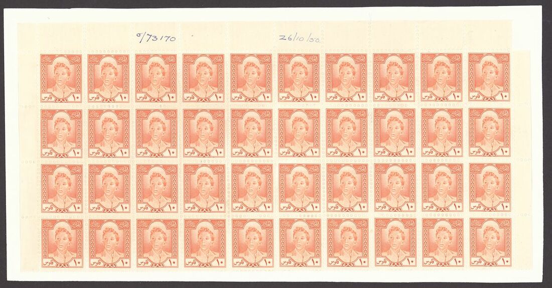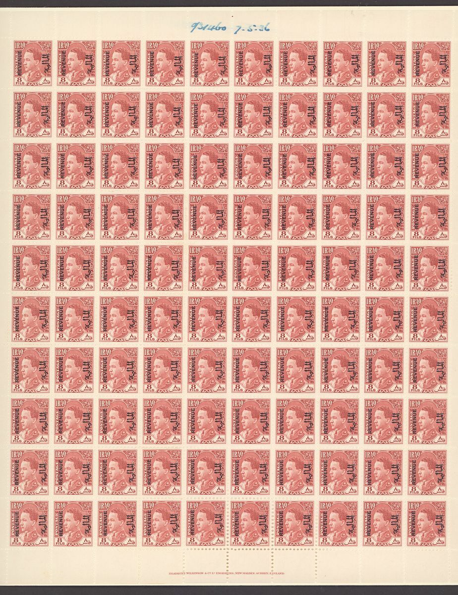 1936 Revenue 5f. grey-green and 8f. scarlet in complete imprimatur sheet of one hundred, also 1950 10f. red-orange without surcharge imprimatur block of forty (10x4) each mounted on carton paper with order numbers and dated in manuscript; some perf. splitting and other minor faults, otherwise fine and a scarce trio. Ex Bradbury Wilkinson archive