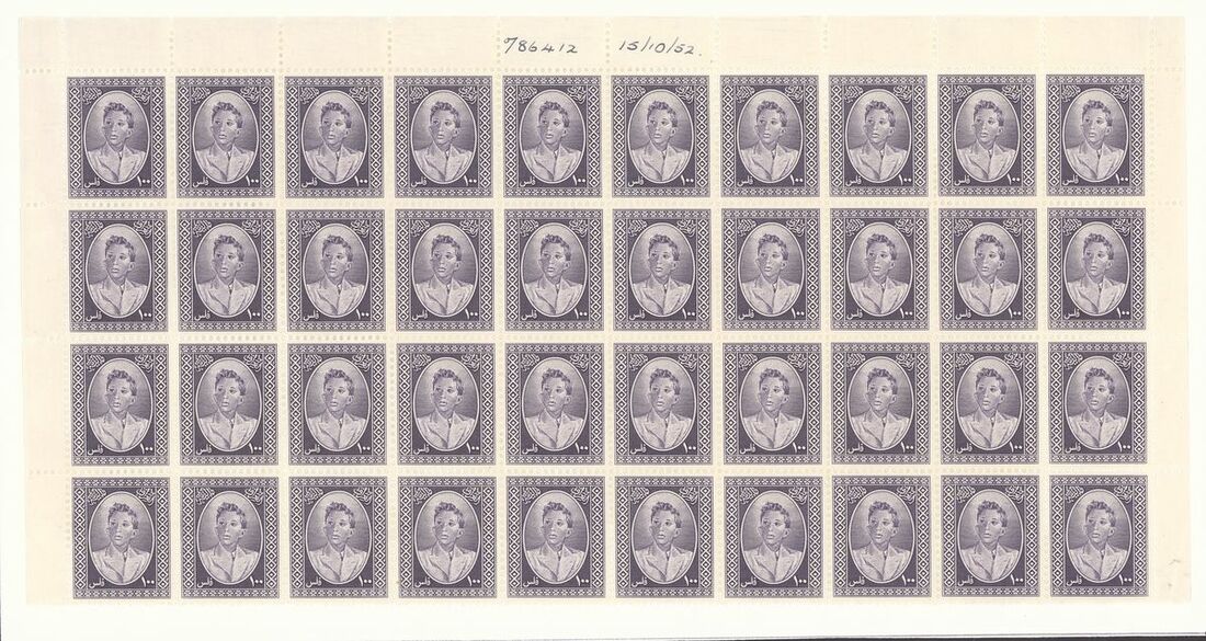 1952 Revenue 100f. violet imprimatur block of forty (10x4) mounted on carton paper - though mostly come away - and with order number '0/86412' and date '15/10/52' in manuscript in the upper sheet margin. Ex Bradbury Wilkinson archive
