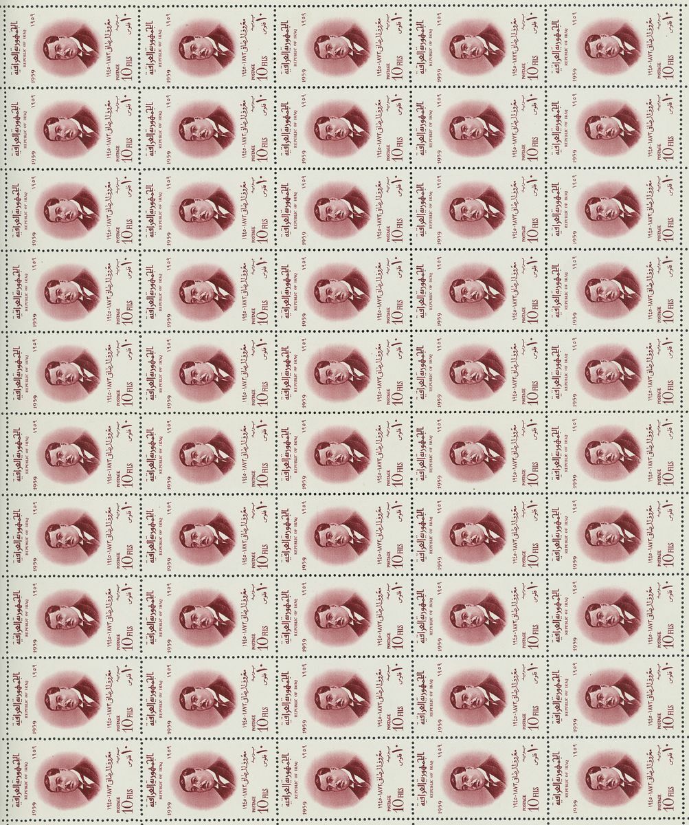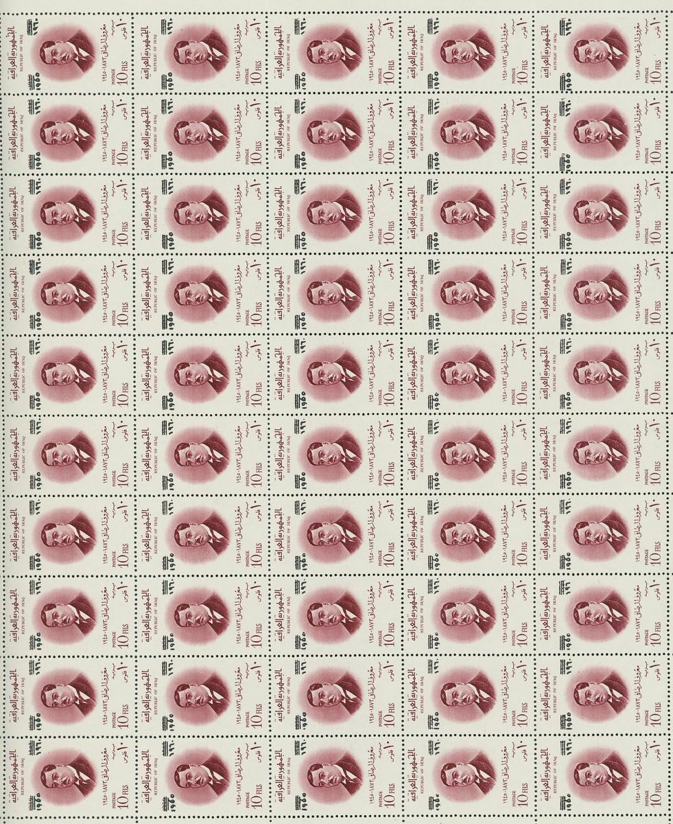 1960 Al-Rasafi Commemoration 10f. complete sheet of fifty, the third stamp from bottom with constant variety missing Arabic "0", also 1966 10f. complete sheet with 1960 overprint omitted, unmounted mint, fine and rare. S.G. 539, 732, £975+
