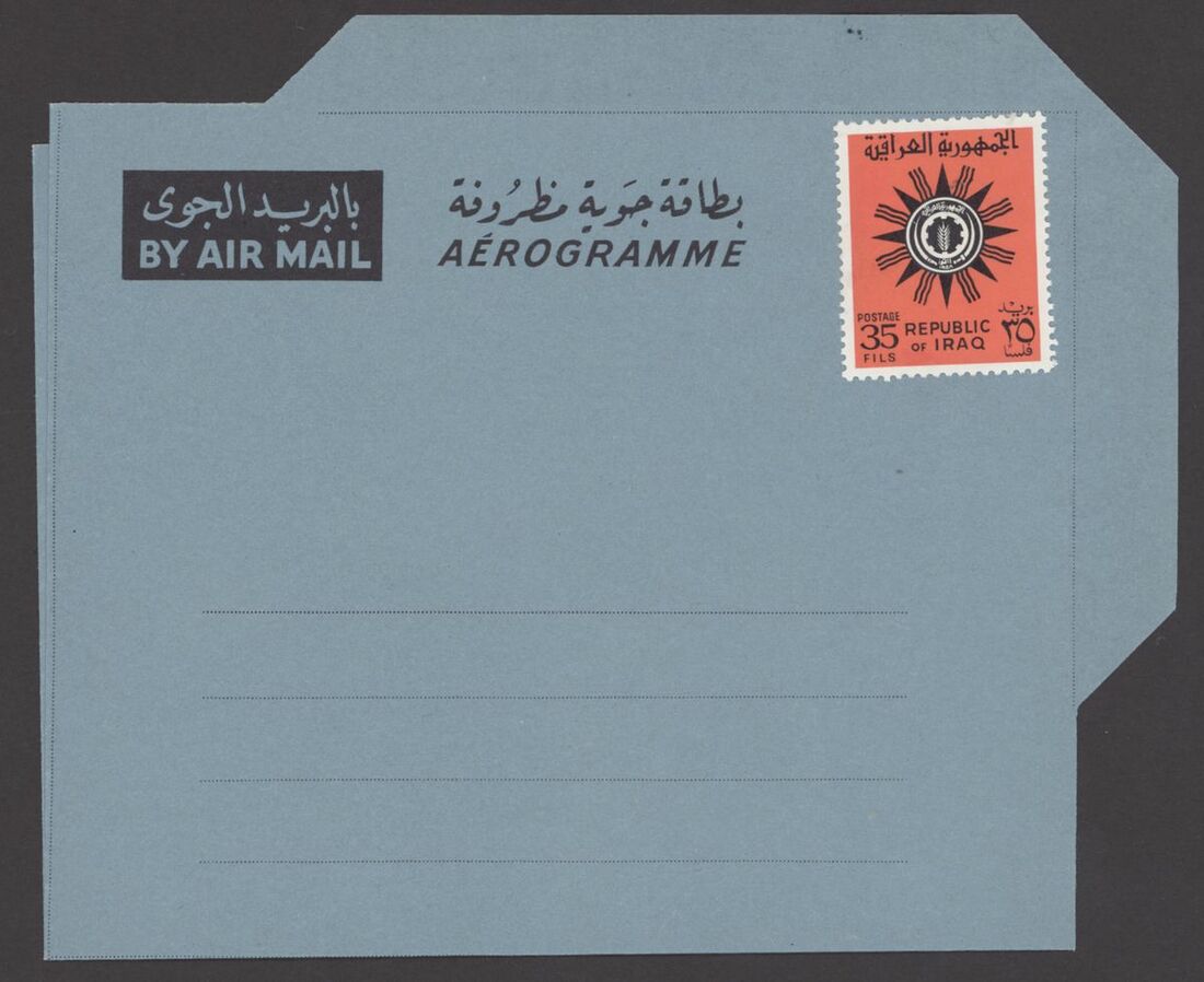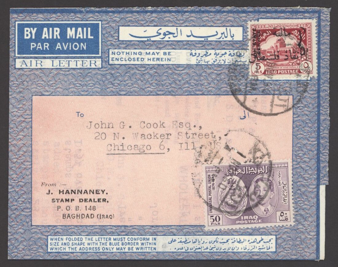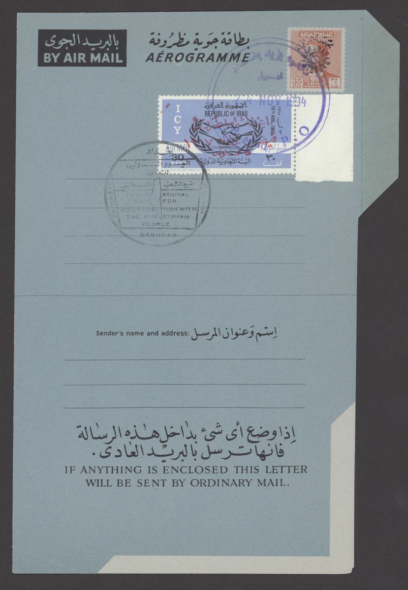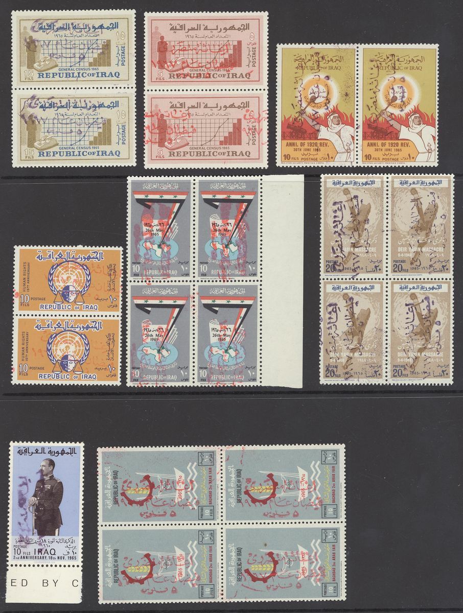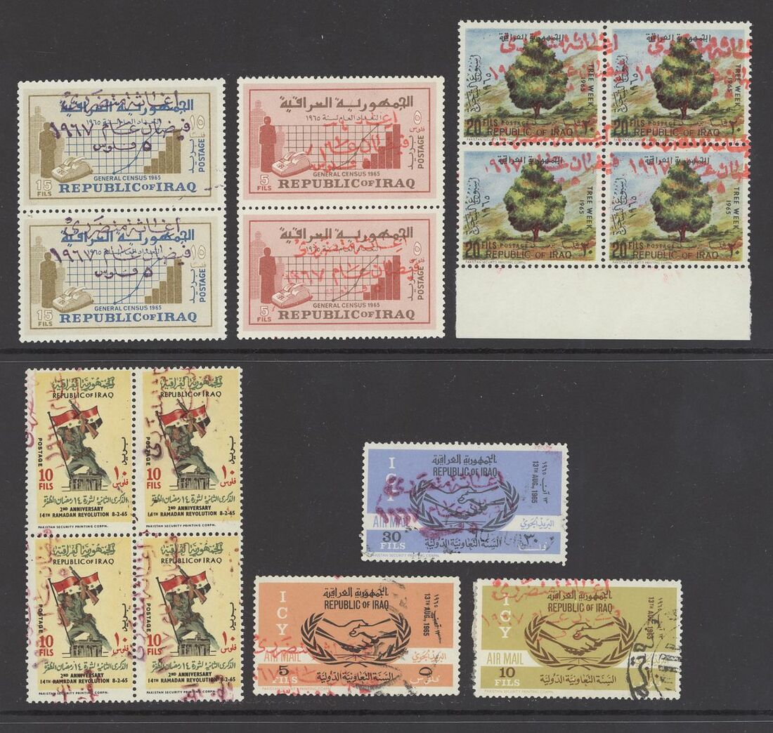 1967 Republic Flood Relief Surcharges, various sets with blocks of four (5), pairs (6) etc. both mint and used; also Postal Stationery 1945-90s Air letter mail and aerogrammes (10) in different types including letter from Basrah to Surrey, Baghdad to Chicago, used and unused aerogramme forms. An interesting group