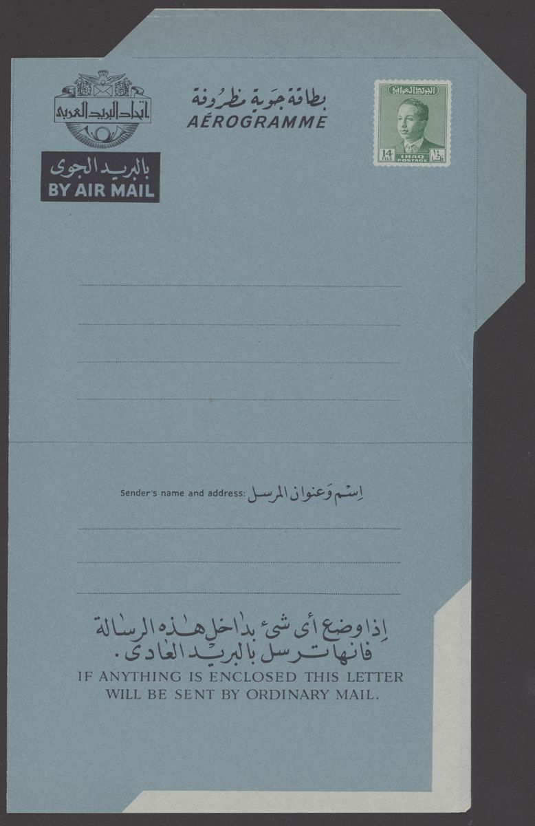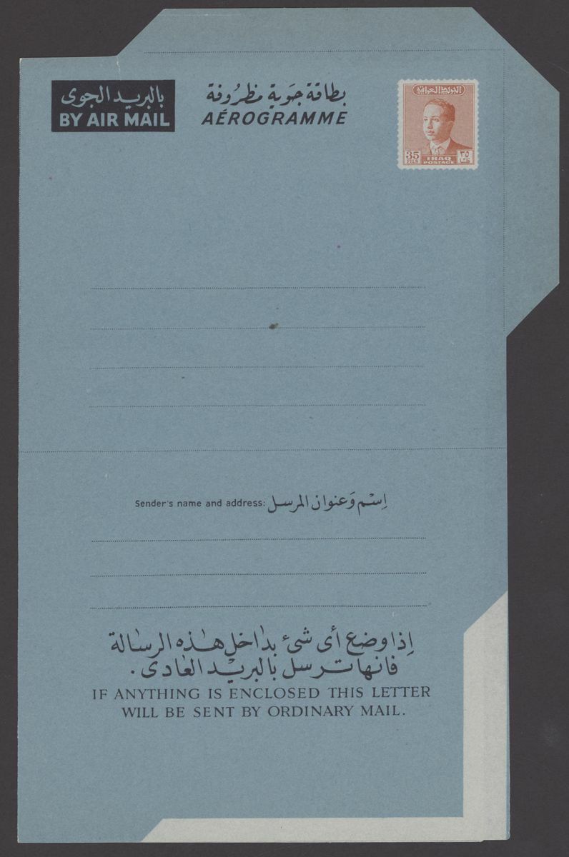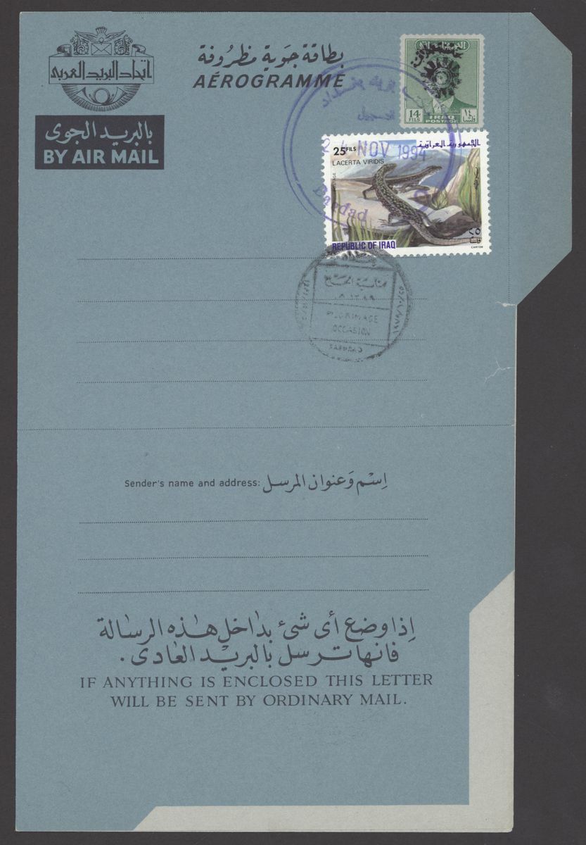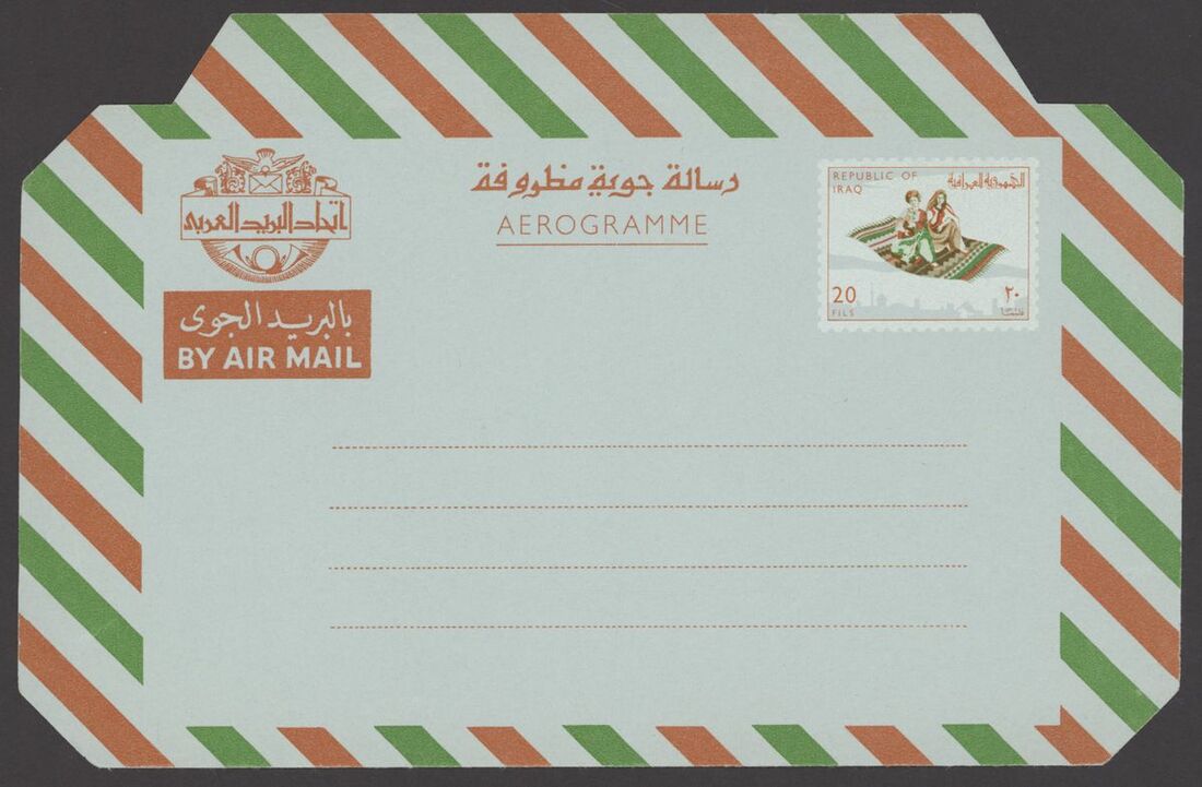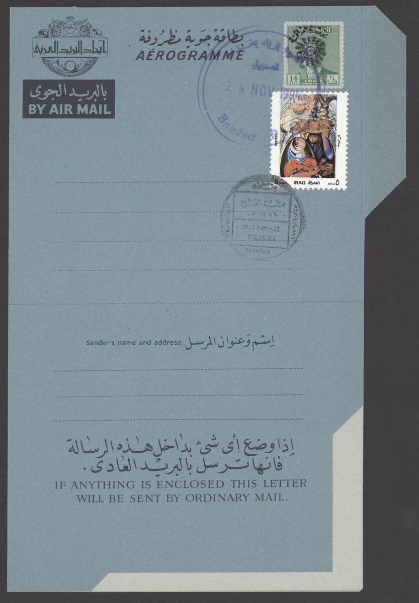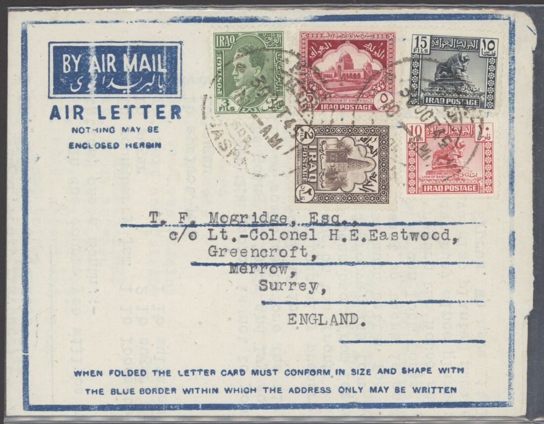 1967 Republic Flood Relief Surcharges, various sets with blocks of four (5), pairs (6) etc. both mint and used; also Postal Stationery 1945-90s Air letter mail and aerogrammes (10) in different types including letter from Basrah to Surrey, Baghdad to Chicago, used and unused aerogramme forms. An interesting group