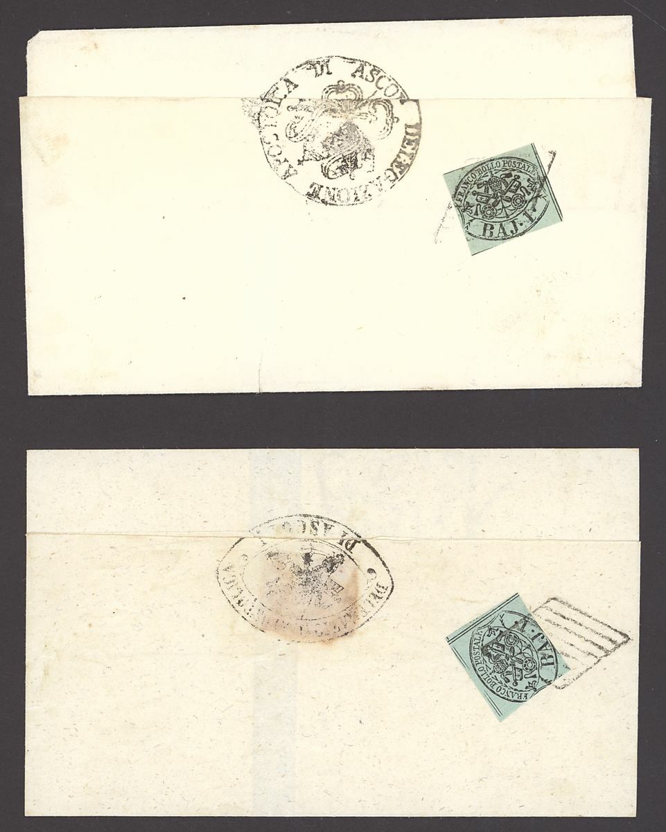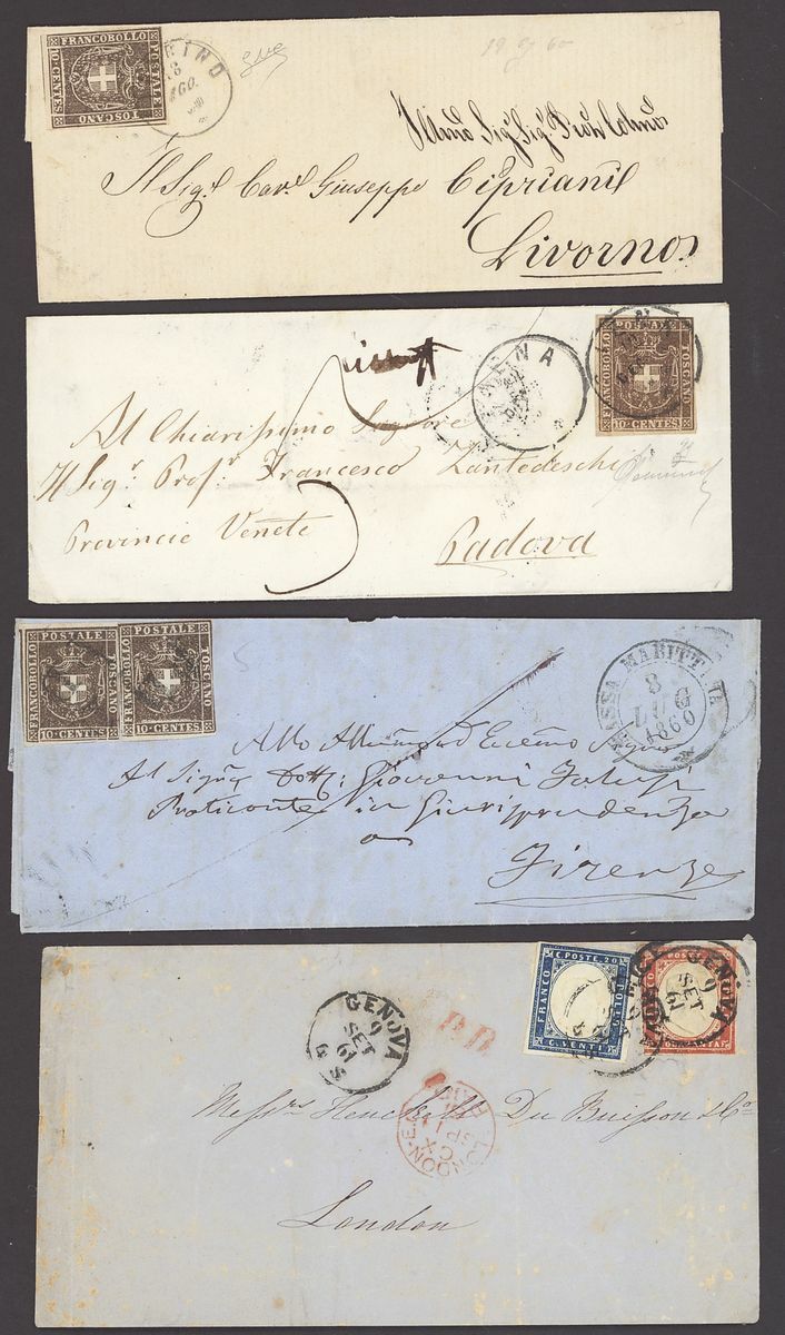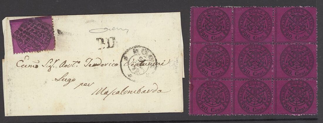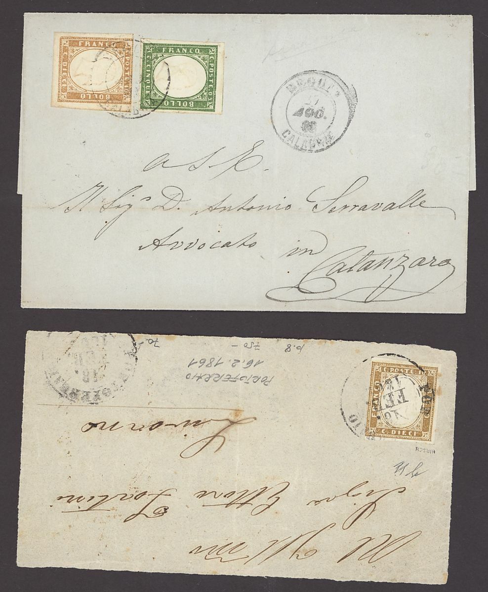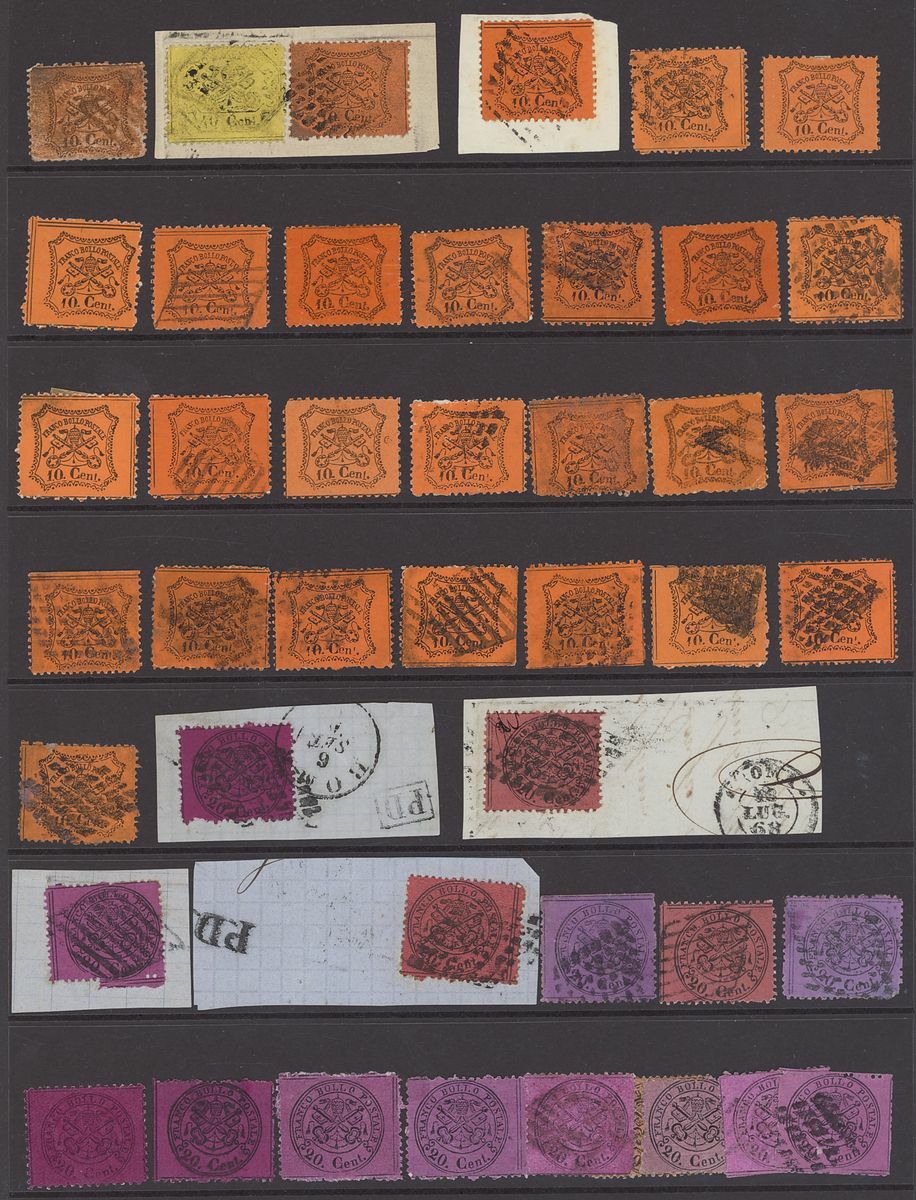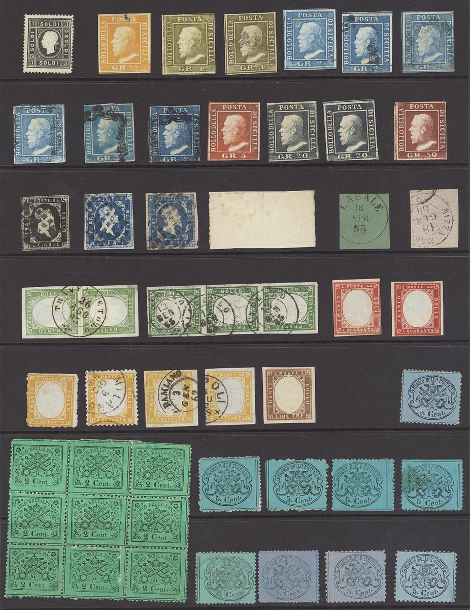 1851-1862 mint and used stamps and postal history collection neatly arranged on four hagner pages including 1858 Lombardy Venetia 3s. black apparently unused and regummed (signed Brun), Sicily mint ½g., 1g., 2g., 5g., 20g. (2, one with Cardillo certificate), 50g., Sardinia 1851 5c. used, 20c. used (2), 1853 20c. embossing proof on white paper horizontal pair (Cardillo certificate), 40c. used, 1855-63 5c. vertical pair with "Traversetolo" c.d.s. (P.12, Ex Bolaffi, Certificate Moscadelli), 5c. vertical strip of three with "Pianello" c.d.s. (P.13, Ex Bolaffi, Certificate Moscadelli), 3l. mint (certificate Sorani), Papal State duplicated 1868 mint and used selection, mixed condition, an interesting lot.