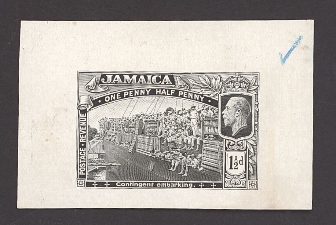 1919-21 1½d. die proof in final stage in black on glazed wove paper (67x43mm.) showing shading corrections to the King's head, blue crayon tick in upper right margin, fine.