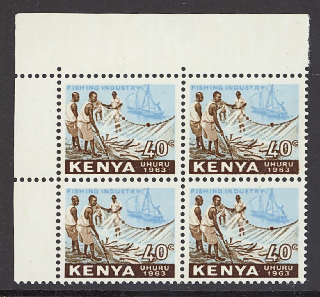 Kenya 1963 Independence 40c. corner block of four, variety printed on the gummed side, fine unmounted. S.G. 6a, £400+