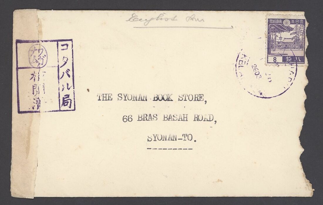 1943 envelope to Singapore bearing Japanese 8s. tied by