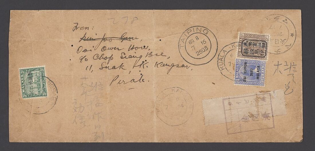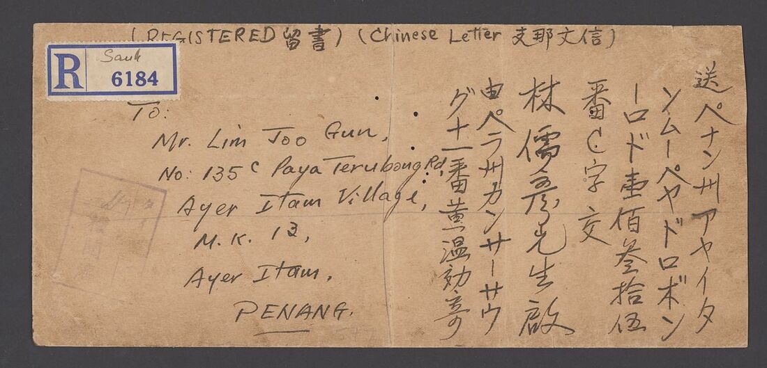 1943 (14 July) envelope (223x100mm.; with letter) registered from Sauk (sender's address on reverse) to Penang, bearing on reverse Perak 5c. with black single-frame chop, 15c. with Dai Nippon overprint and Selangor 3c. with Kanji overprint, all tied by