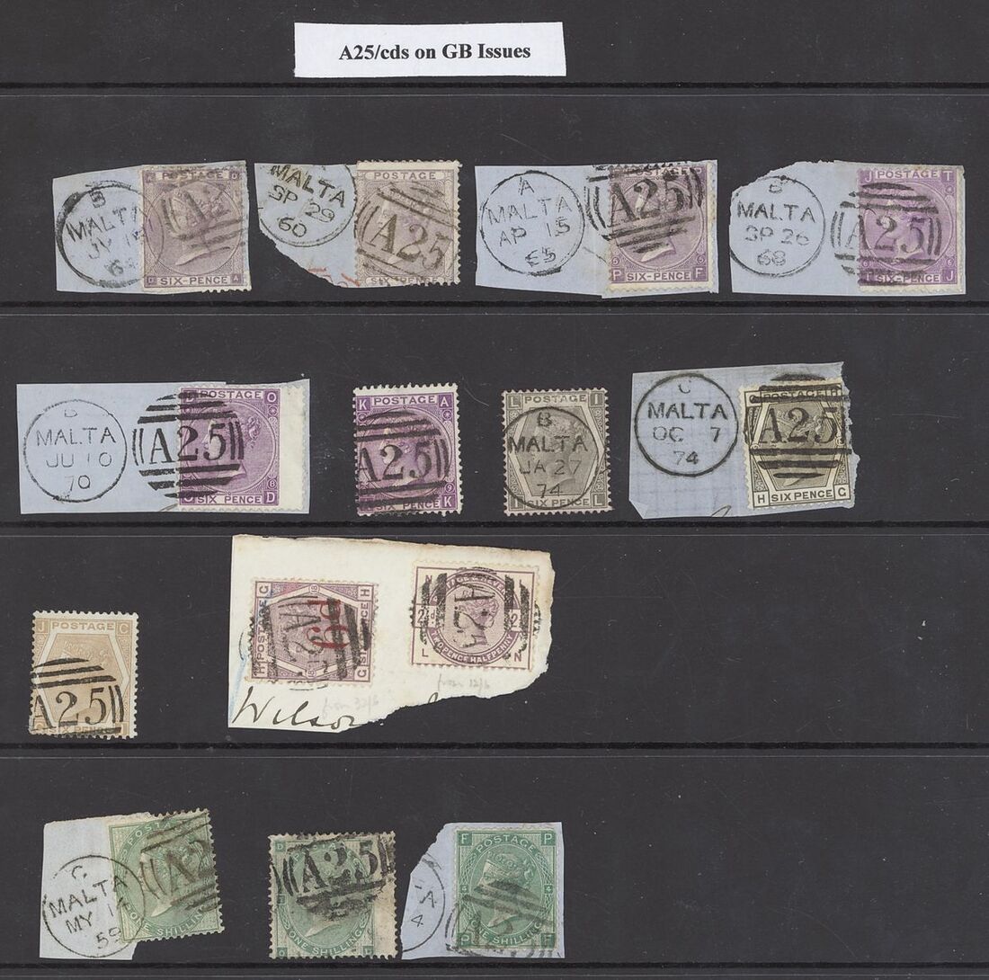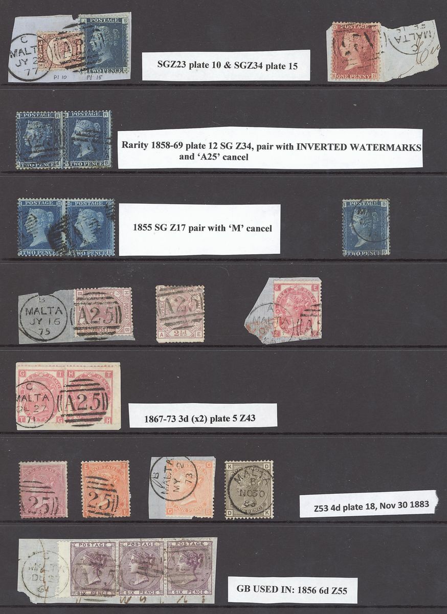 Selection (34) arranged on two hagner pages including 1855 2d. blue pair with "M" obliterator, 1858-69 2d. blue plate 12 pair with watermark inverted (unpriced in the catalogue), 1865 3d. plate 4, 1856 6d. strip of three on small piece, 6d. on 6d on small piece with 2½d lilac, 1856 1/-, usual mixed condition, a very interesting lot for the specialist .