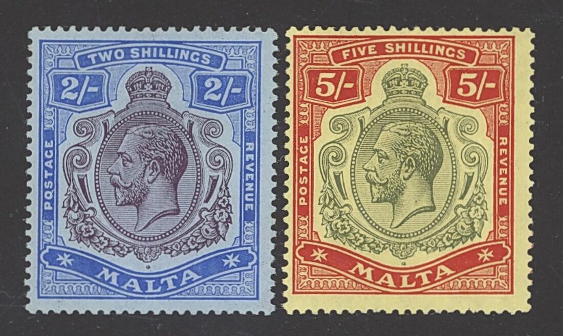 1914-21 2/- purple and bright blue on blue and 5/- green and red on yellow both variety nick in top right scroll, large part original gum, fine. S.G. 86c, 88c, £975