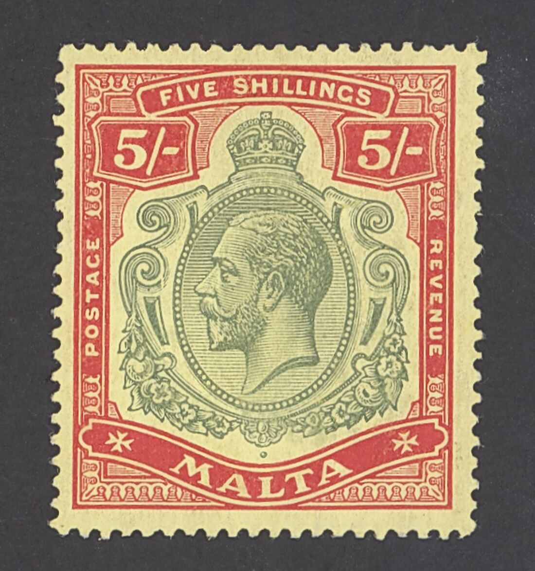 1914-21 5/- green and red on yellow variety break in line below left scroll, large part original gum, a short perf on the right side otherwise fine. S.G. 88e, £800