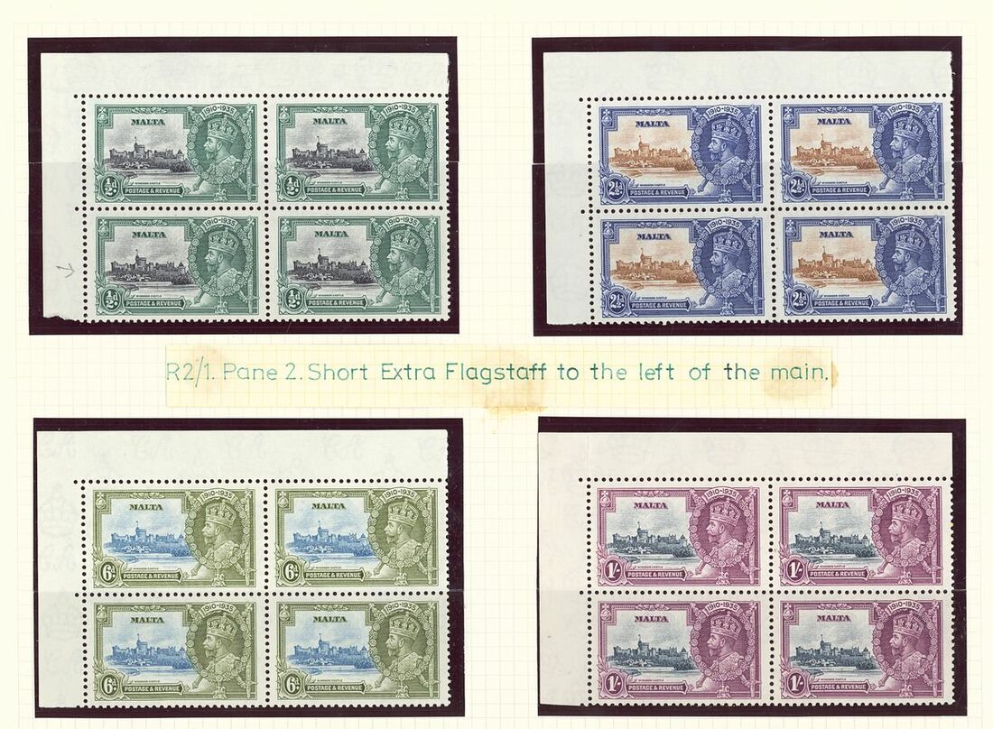 1935 Jubilee set in blocks of four from the upper left corners of the sheets, each containing the short extra flagstaff variety, original gum (the varieties all unmounted mint), the 2½d. block slightly wrinkled, fine and scarce. S.G. 210b-213b, £1,040+