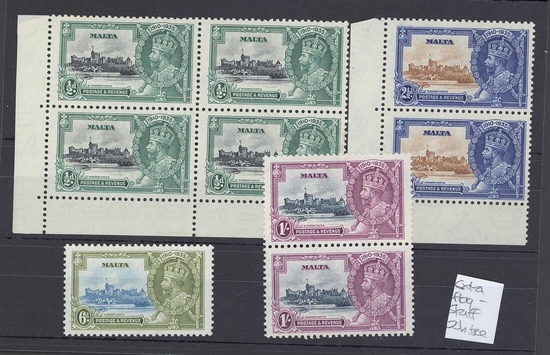 1935 Jubilee, variety extra flagstaff mint set including ½d. black and green in block of four unmounted , 2½d. brown and deep blue in vertical pair unmounted, 6d. light blue and olive-green large part original gum, 1/- slate and purple in vertical pair large part original gum, a fine group. S.G. 210a, 211a, 212a, 213a, £820+