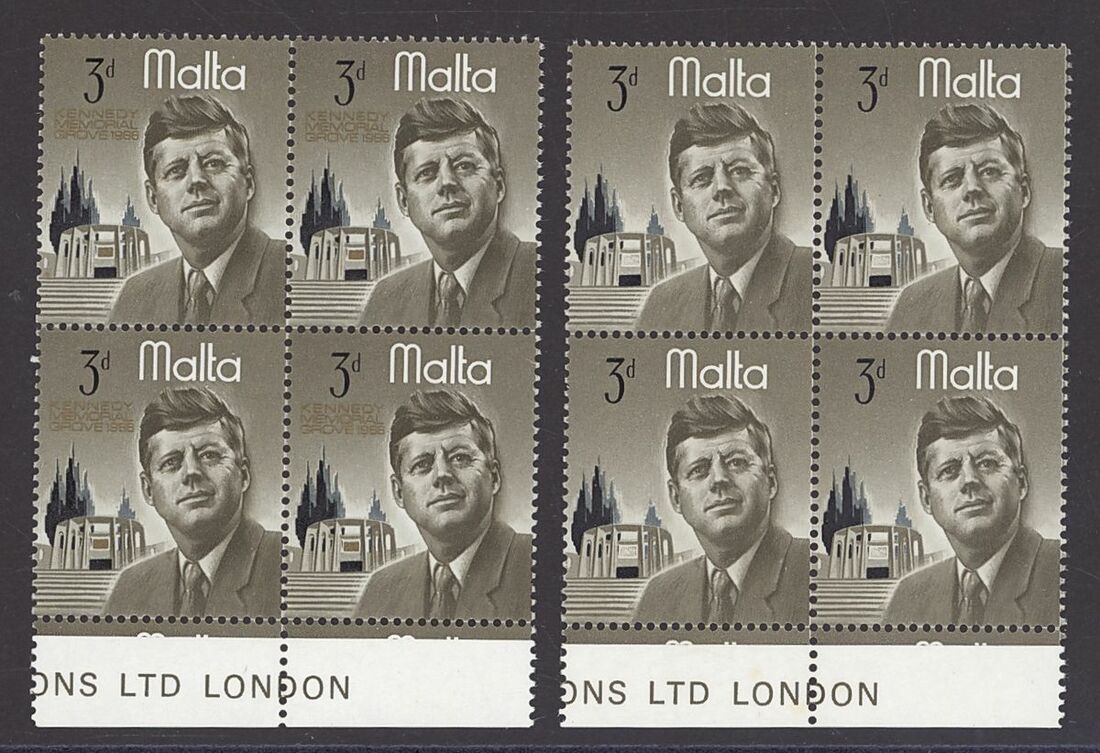 1966 Kennedy 3d. block of four with part imprint showing gold inscription omitted, fine unmounted mint. With matched normal block of four for comparison. S.G. 371a, £1,200+