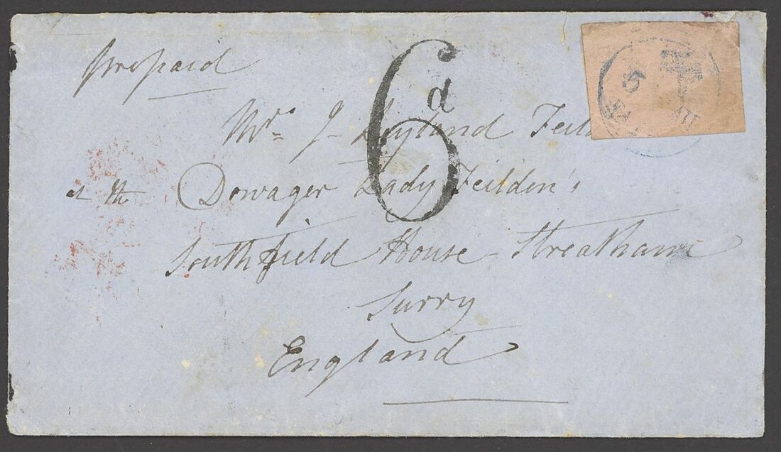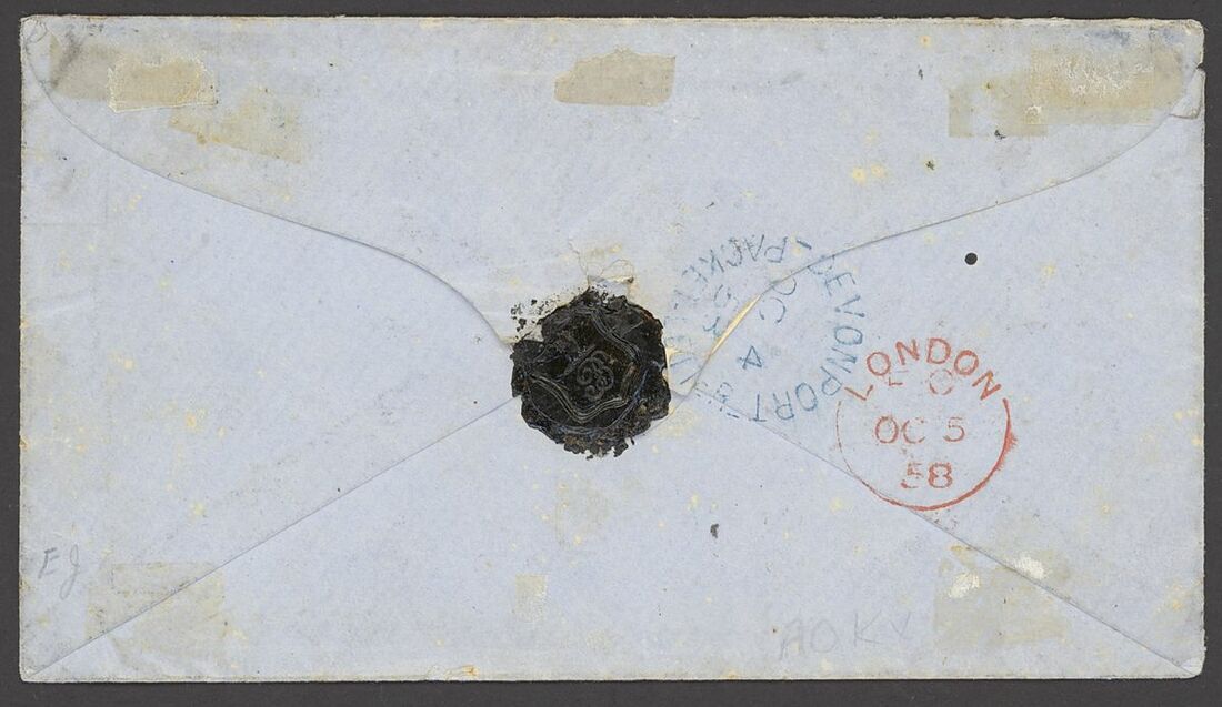 1858 (5 Aug.) envelope to England, bearing 1857 imperf. embossed 3d. rose, placed sideways and cancelled with light "Crown/