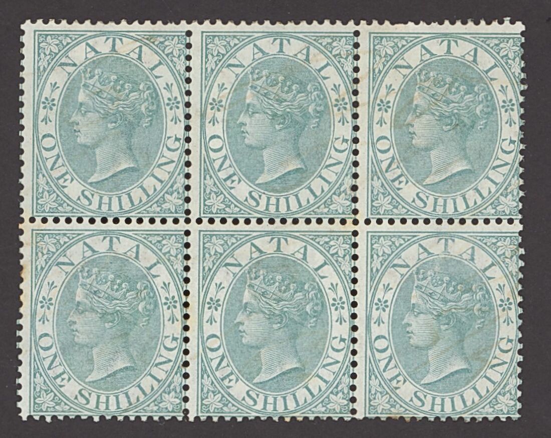 1867 (Apr.) CC 1/- green block of six (3x2) with pen-cancel very much reduced. A scarce multiple. S.G. 25