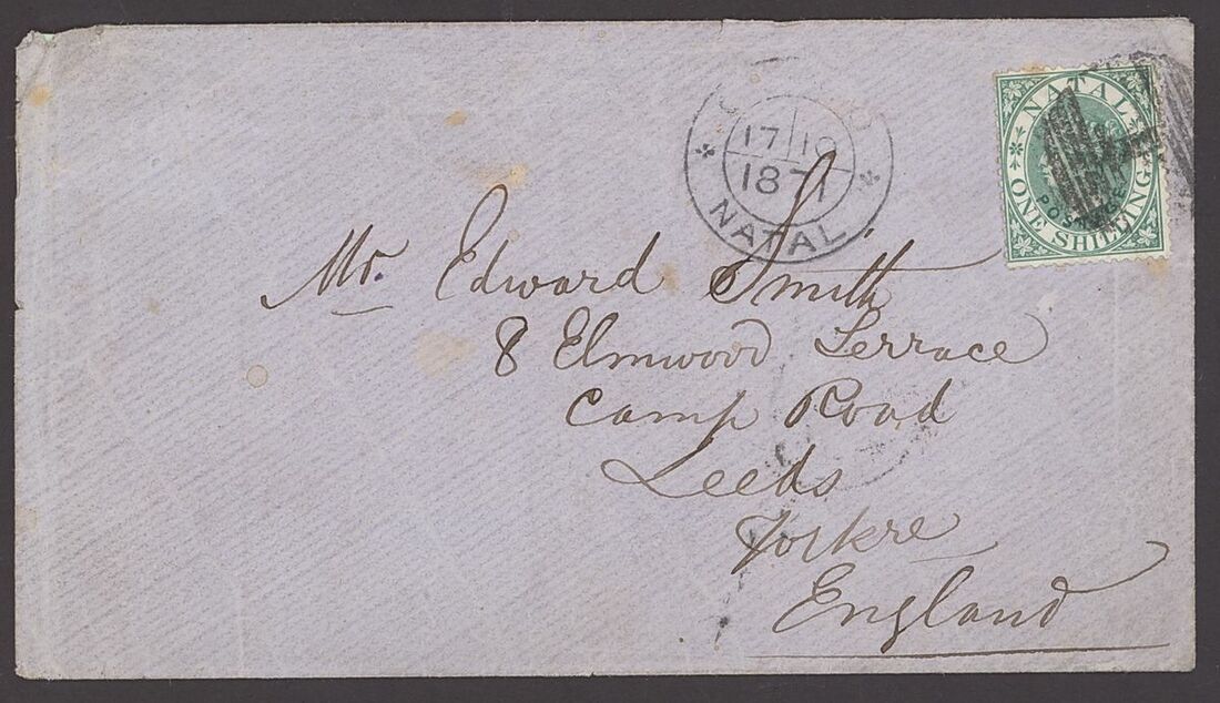 1871 (17 Oct.) envelope to Leeds, bearing 1870 1/- green with green overprint tied by "1" obliterator, showing Durban datetamp alongside and arrival c.d.s. (5.12) on reverse. S.G. 59