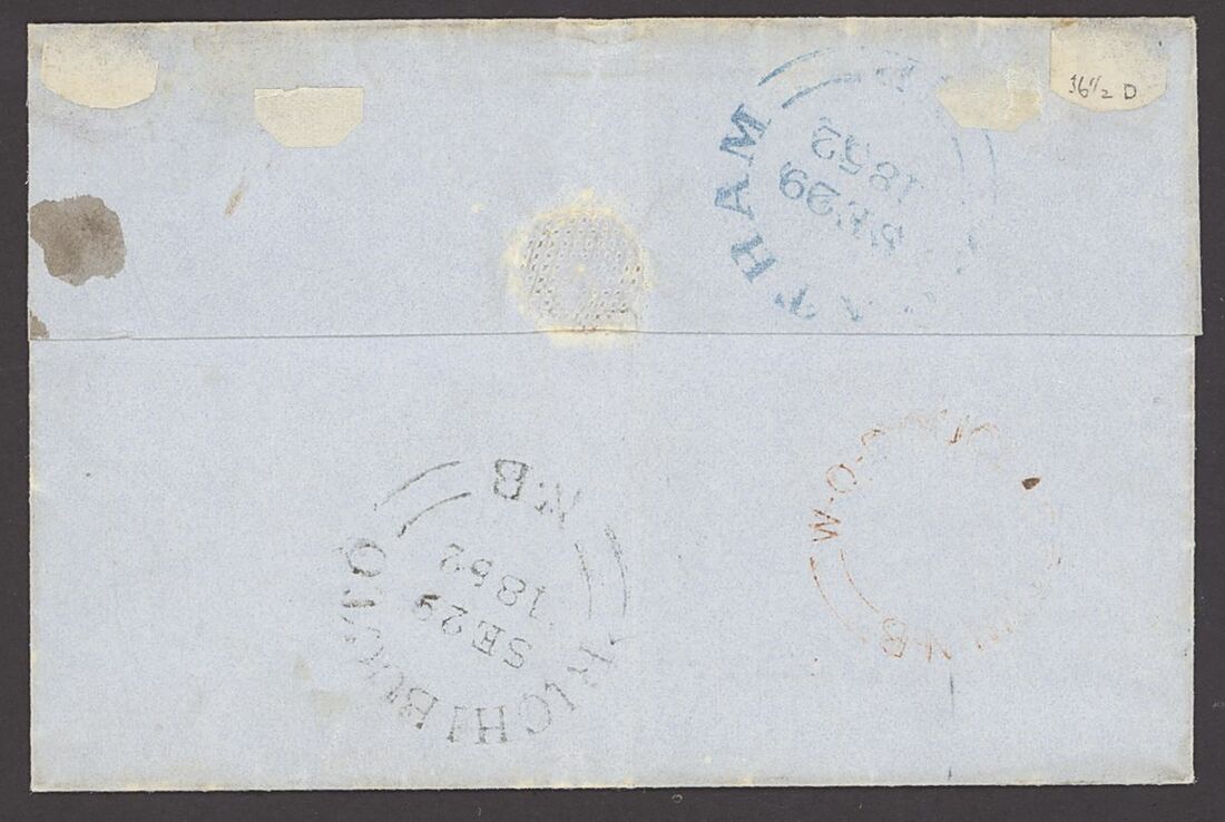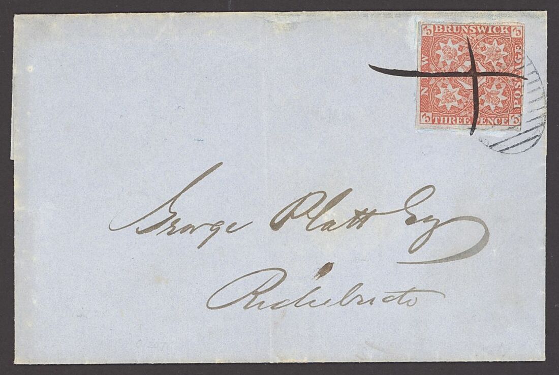 1851-60 3d. bright red with close to good margins tied by oval grid plus pen cancel on 1852 (29 Sept.) entire letter from Chatham to Richibucto showing, on reverse, despatch and arrival (29.9) datestamps. A fine and scarce cover. S.G. 1, £900.