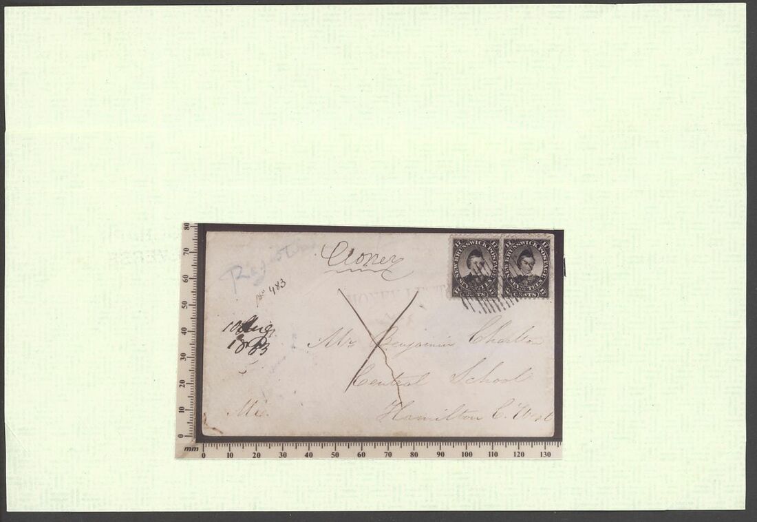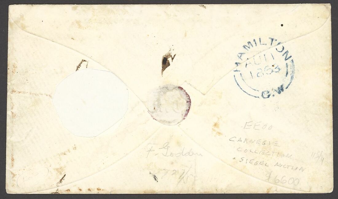 1866 (Aug.) envelope to Hamilton, Canada West, marked "Money" and "Registered", bearing 1860-63 17c. (2) tied by oval of bars and unframed