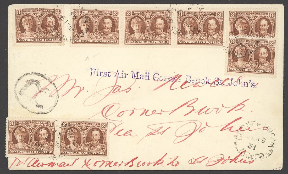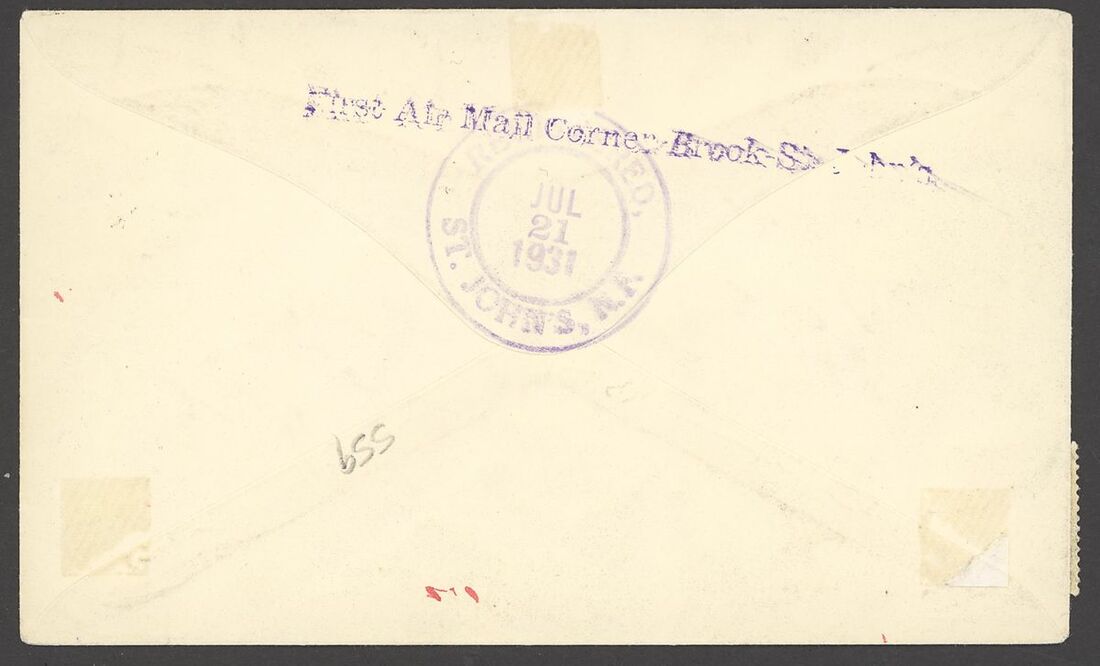 1931 (19 July) Corner Brook-St. John's flight envelope registered to St. John's, bearing 24c. cancelled by Corner Brook c.d.s., showing "R" in oval, straight-line "First Air Mail Corner Brook-St. John's" in violet and, on reverse, Registered St. John's double-ring d.s. in violet. Rare with very few covers carried