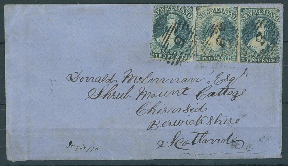 1870 (11 Jan) envelope from Timaru to Scotland, bearing 1864-71 2d. blue (3), each cancelled by "5" in oval of bars, despatch, Christchurch (12.1) and arrival (28.3) c.d.s. on reverse, minor creasing and cover slightly roughly opened at bottom.