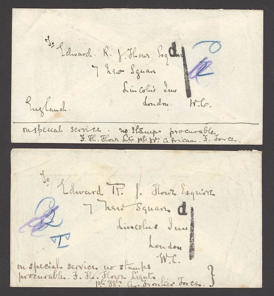 1899 unstamped Soldier's envelopes (2) shipped in consecutive days (1st and 2nd AP 1899) marked "On special service, no stamps available. F.H. Howe Lt. 1st. West African Frontier Force" addressed to London, showing a fair strike of "
