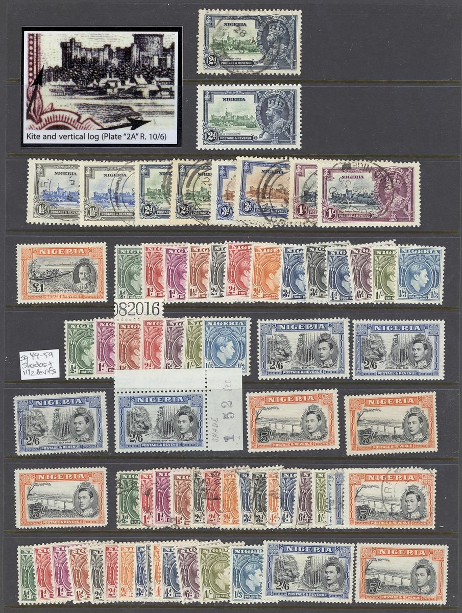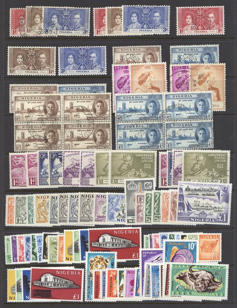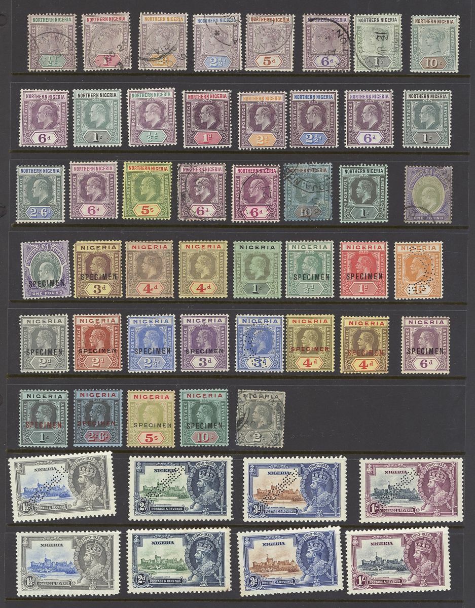 1900-1960s mint and used collection arranged on four Hagner pages including Northern Nigeria 1900 10/- mint, 1910 10/- used, Southern Nigeria 1903-04 £1 (2, Specimen and used), Nigeria 1921-32 ½d. to 10/- Specimen set, 1935 Jubilee set perforated