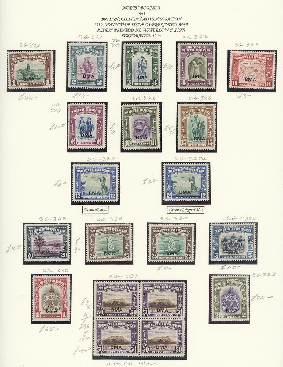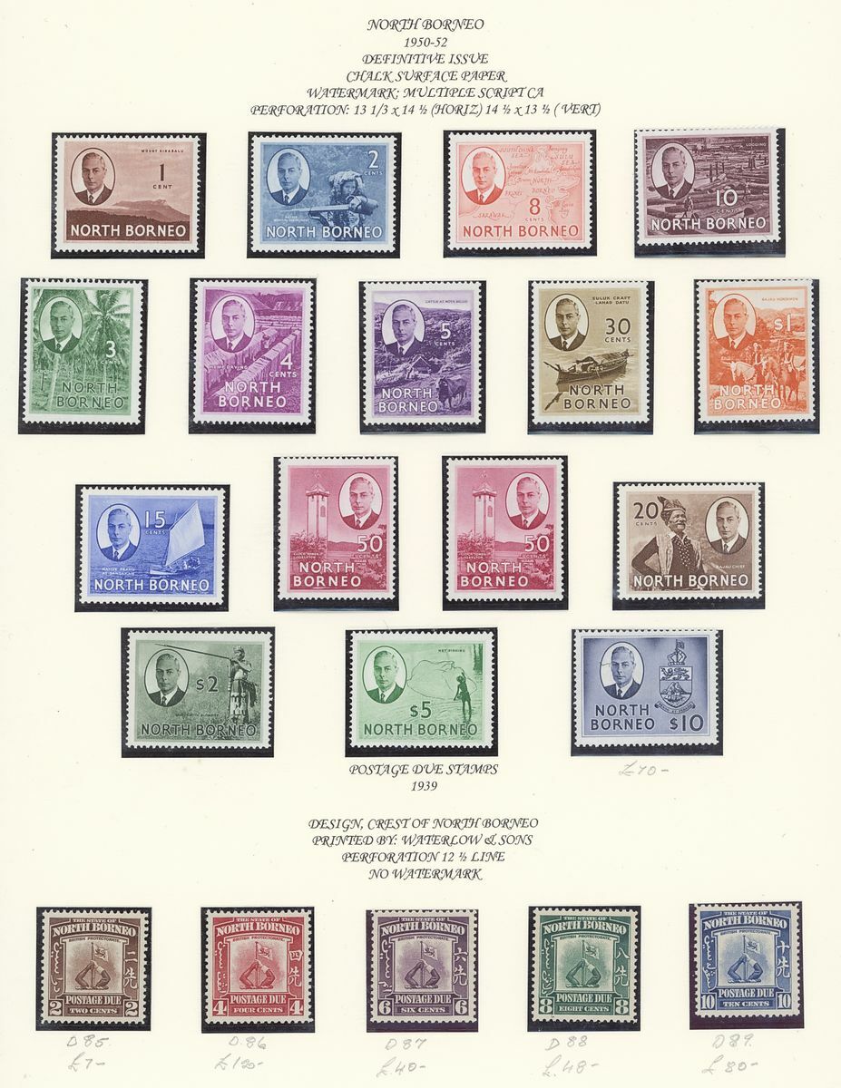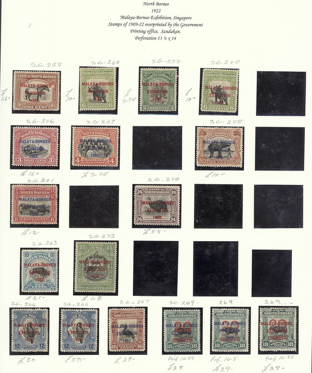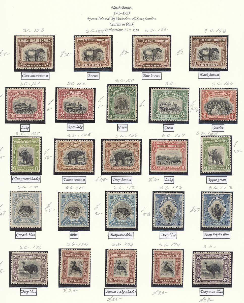1899-1961 mint collection on album pages including 1899 Surcharges, 1904-05 surcahrges to 4c. on $5, 1909-23 set to 24c. and including shades, 1911 perf. 14½ x 15 25c., 50c. and $1, 1918 Red Cross overprint set to $10, 1922 Malaya-Borneo Exhibition with values to 25c., 1925-28 set to $2, 1939 part set to $2, 1945 BMA overprint set to $5, 1947 Crown Colony set to $5, 1950-52 set to $10, 1961 set to $10, Postage Due set and Sabah 1964-65 overprinted set to $10; generally good to fine mint
