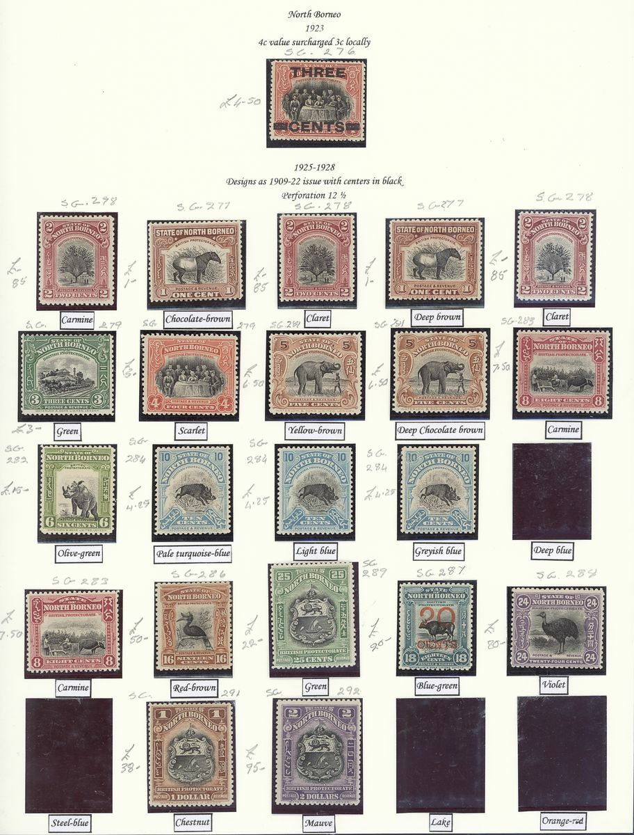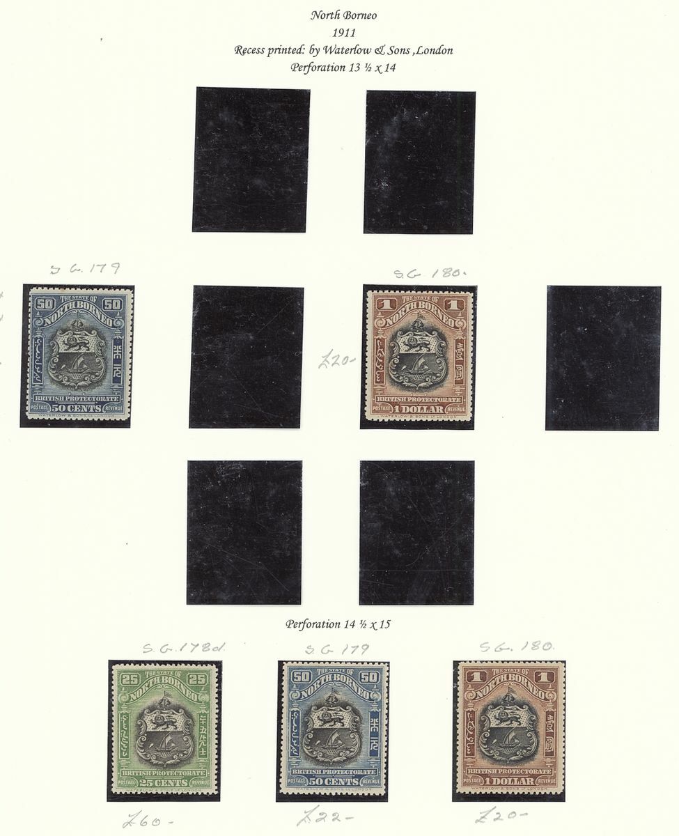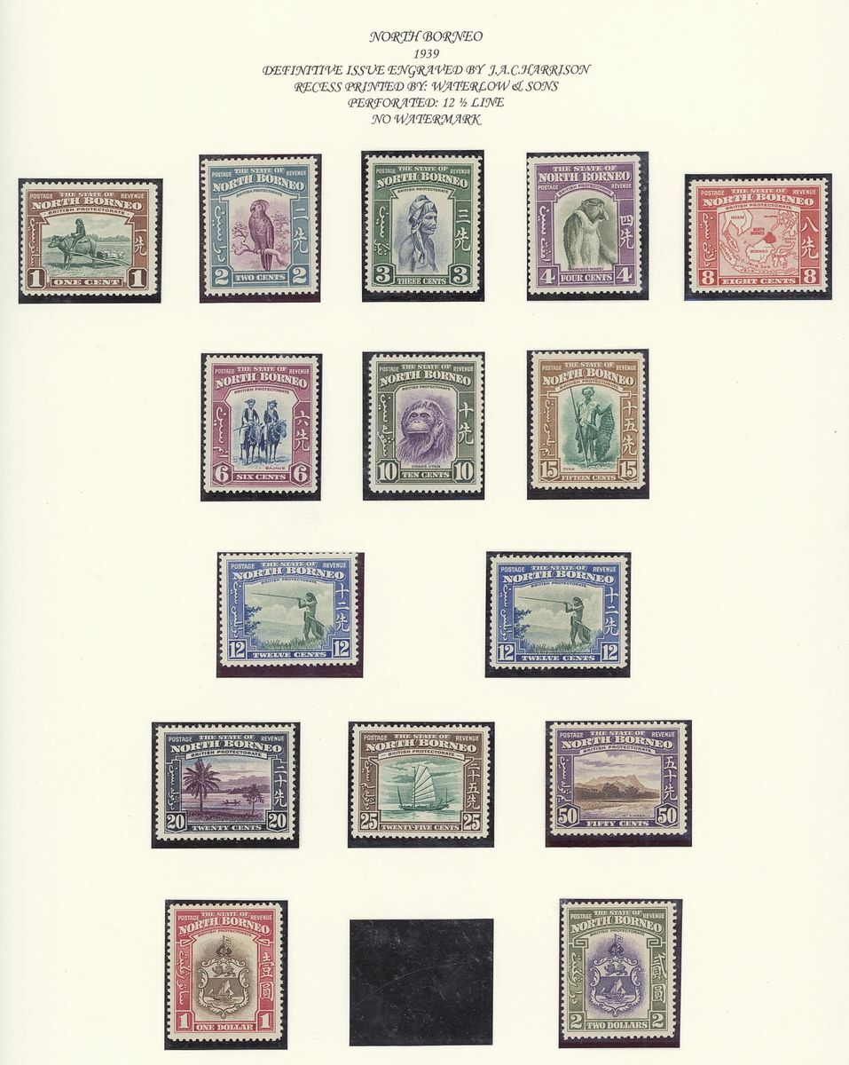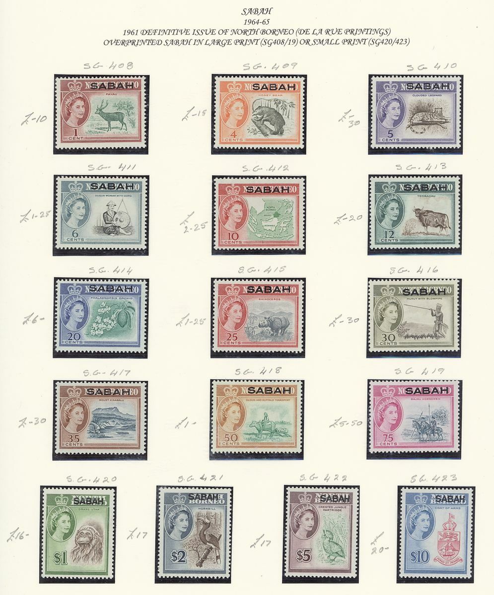 1899-1961 mint collection on album pages including 1899 Surcharges, 1904-05 surcahrges to 4c. on $5, 1909-23 set to 24c. and including shades, 1911 perf. 14½ x 15 25c., 50c. and $1, 1918 Red Cross overprint set to $10, 1922 Malaya-Borneo Exhibition with values to 25c., 1925-28 set to $2, 1939 part set to $2, 1945 BMA overprint set to $5, 1947 Crown Colony set to $5, 1950-52 set to $10, 1961 set to $10, Postage Due set and Sabah 1964-65 overprinted set to $10; generally good to fine mint