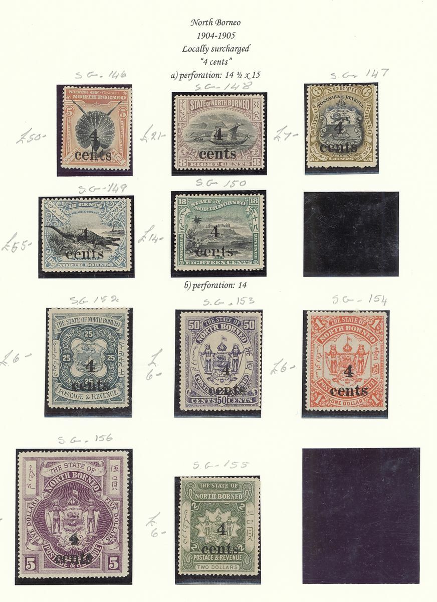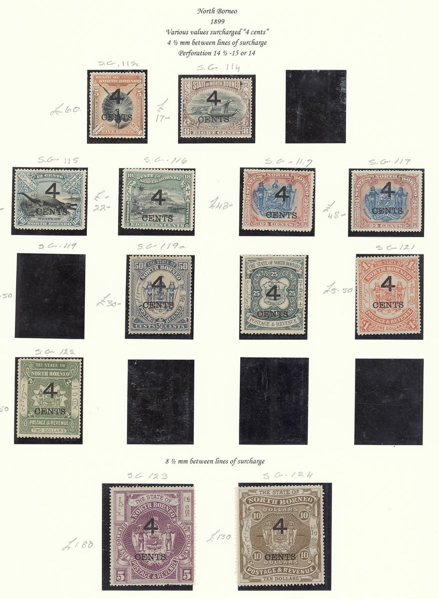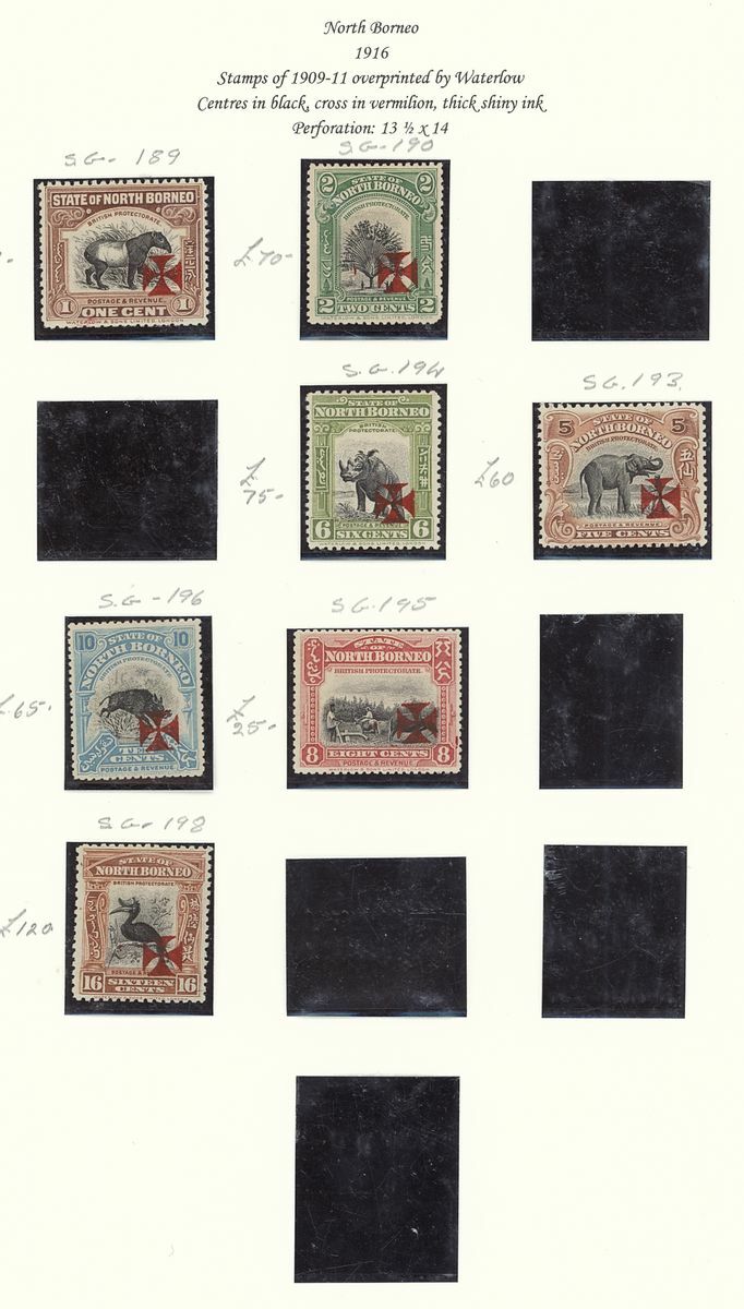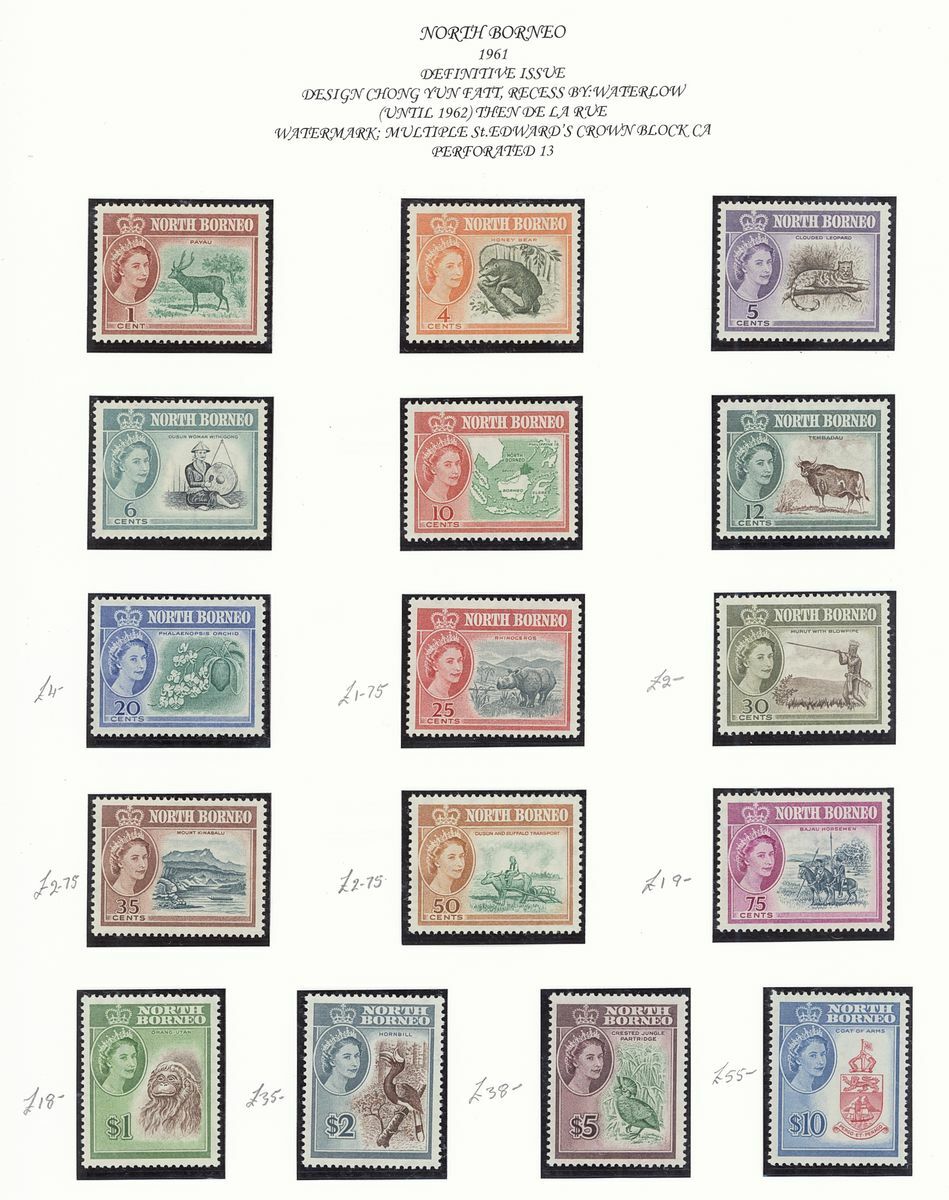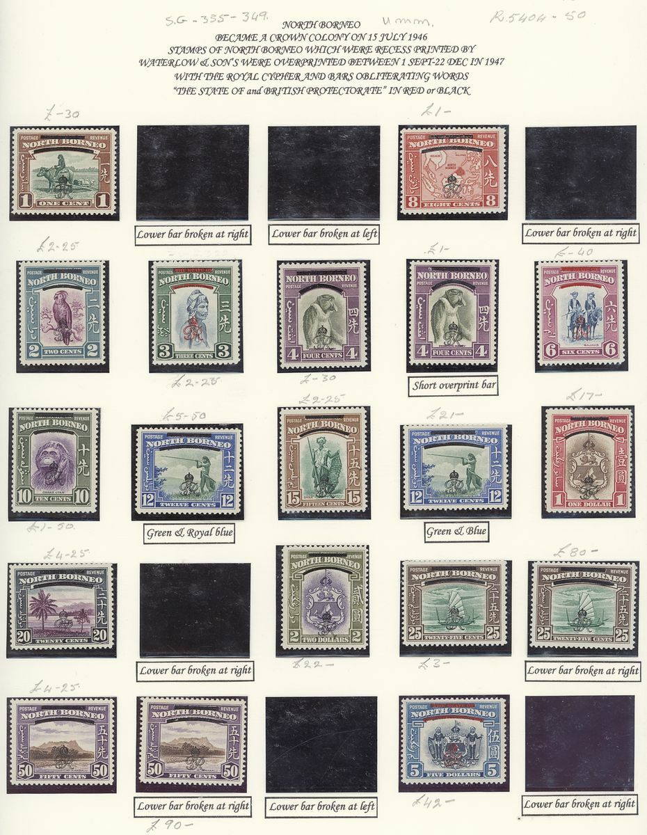 1899-1961 mint collection on album pages including 1899 Surcharges, 1904-05 surcahrges to 4c. on $5, 1909-23 set to 24c. and including shades, 1911 perf. 14½ x 15 25c., 50c. and $1, 1918 Red Cross overprint set to $10, 1922 Malaya-Borneo Exhibition with values to 25c., 1925-28 set to $2, 1939 part set to $2, 1945 BMA overprint set to $5, 1947 Crown Colony set to $5, 1950-52 set to $10, 1961 set to $10, Postage Due set and Sabah 1964-65 overprinted set to $10; generally good to fine mint