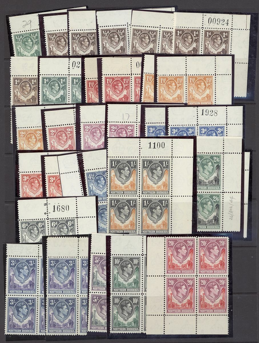 ½d. to 20/- set of twenty-one with additional ½d. brown (3), 1d. brown, 1½d. carmine-red, 1½d. yellow-brown, 2d. purple, 3d. ultramarine, 3d. scarlet, 4½d. blue, 6d. grey, 9d. violet and 3/- violet and blue shades, all in corner blocks of four nearly all from the upper right with many to 3/- showing sheet numbers, fine unmounted mint. A fine and rare group. S.G. 25-45, £1,384