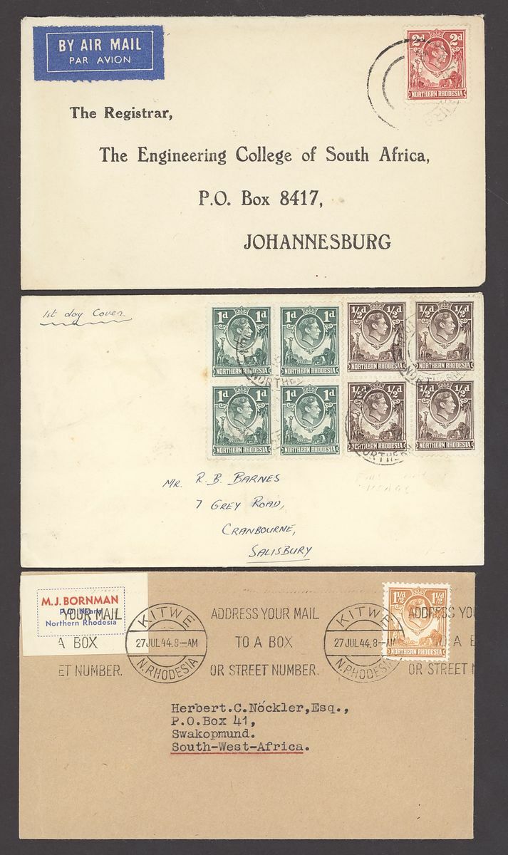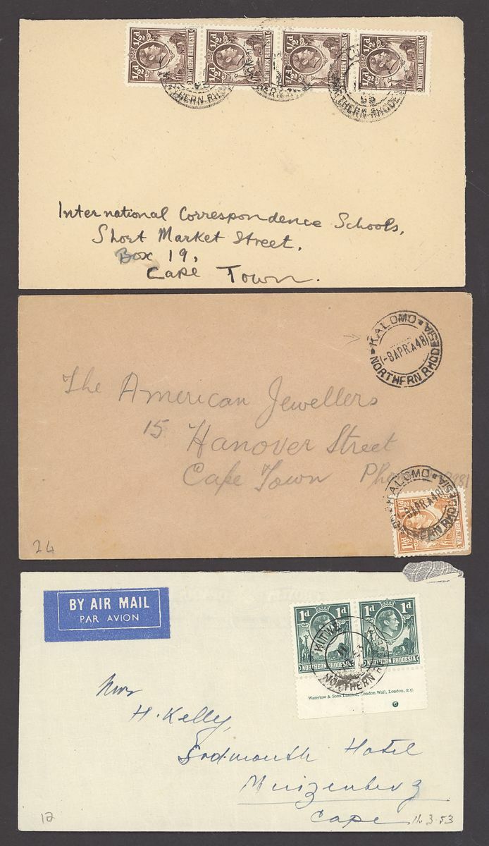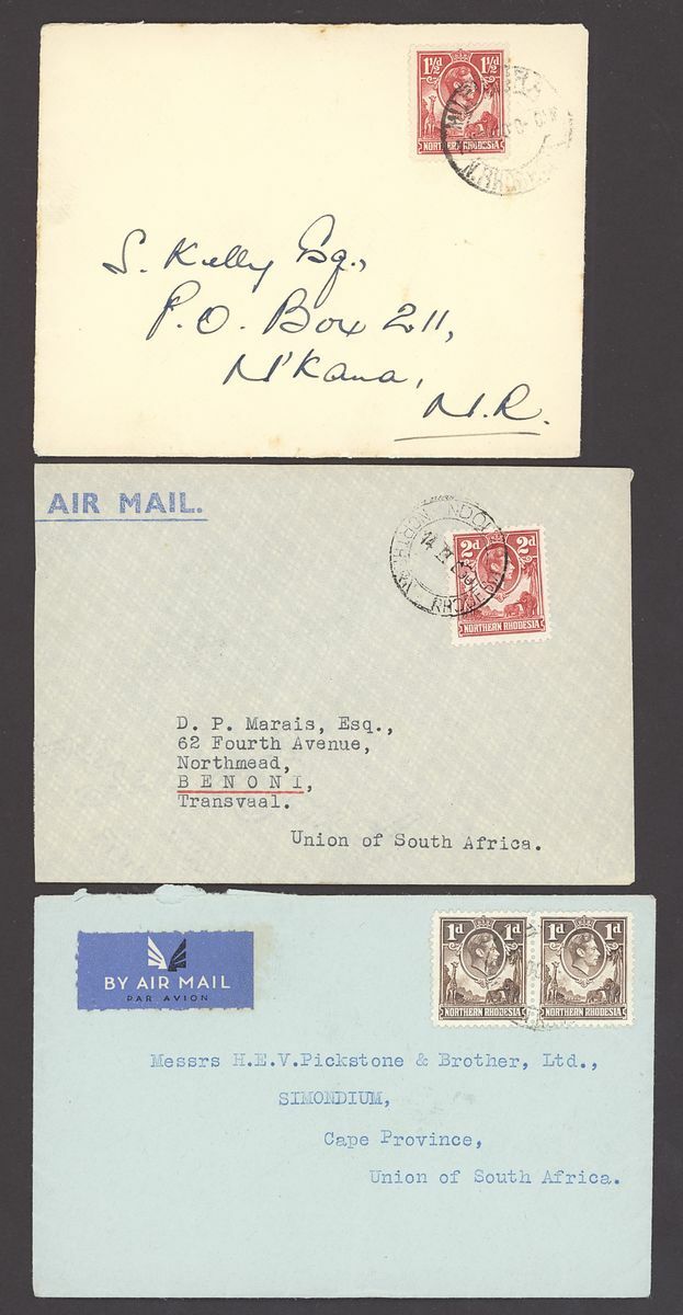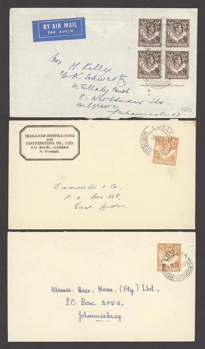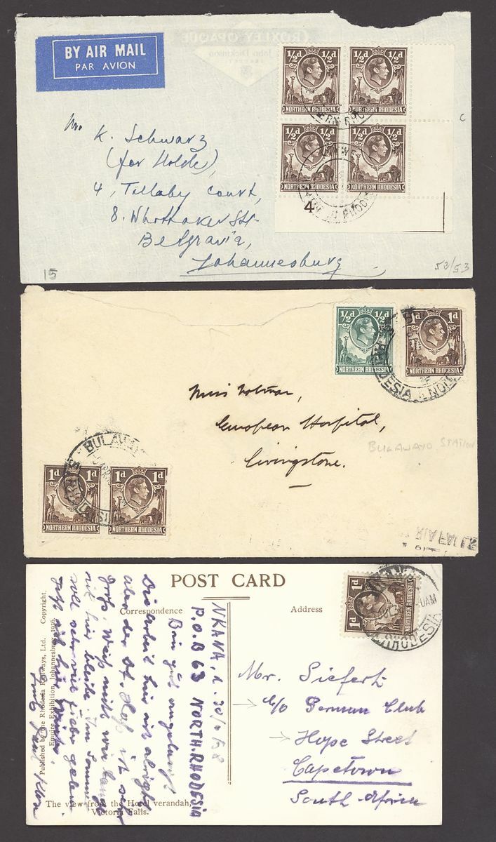 1938-53 collection comprising items addressed within the Rhodesias (8) with rates of ½d. (3), 1½d. (2), 3d. (from Kasama to a District Commissioner at Kawambwa complete with letter), 3½d. and 5d., mail to South Africa (13) with rates of 1d. (postcard), 2d. (5, one with ½d. brown Plate 4 block of four and one with ½d. brown imprint block of four), 1½d. (3), 2d. (3) and 4d. (½d. brown and 1d. green blocks of four used on date of issue), and one to South West Africa at 1½d.