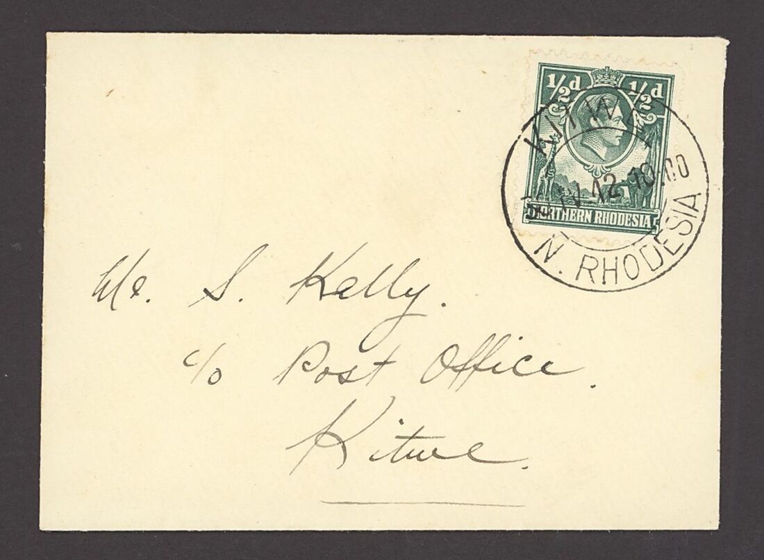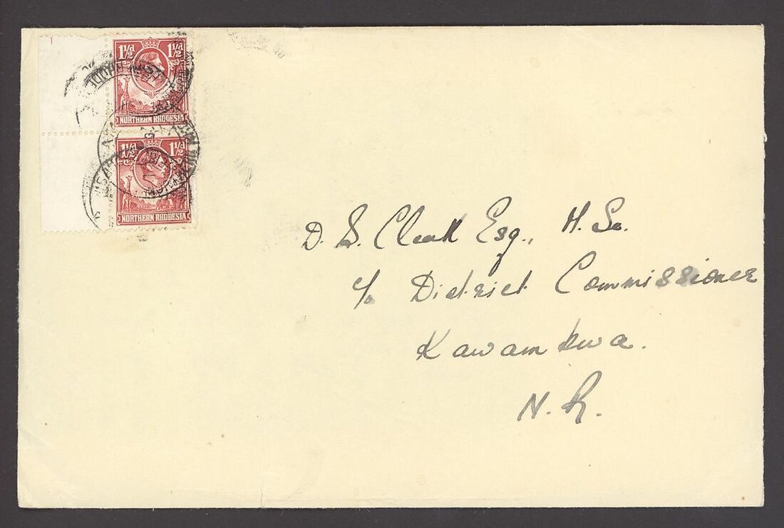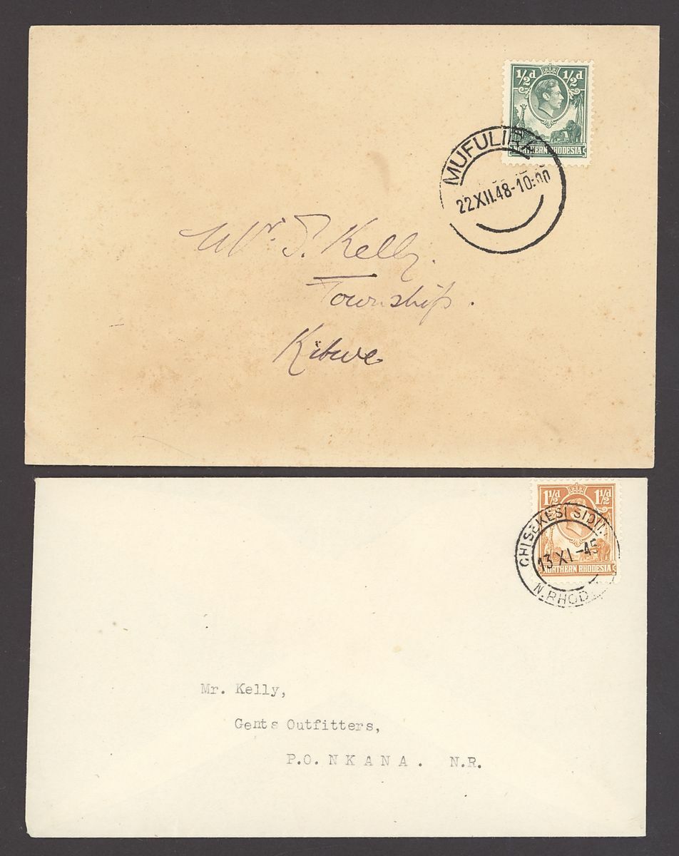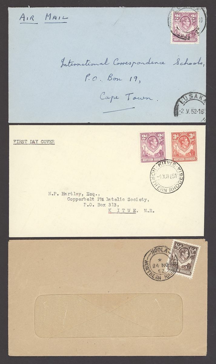 1938-53 collection comprising items addressed within the Rhodesias (8) with rates of ½d. (3), 1½d. (2), 3d. (from Kasama to a District Commissioner at Kawambwa complete with letter), 3½d. and 5d., mail to South Africa (13) with rates of 1d. (postcard), 2d. (5, one with ½d. brown Plate 4 block of four and one with ½d. brown imprint block of four), 1½d. (3), 2d. (3) and 4d. (½d. brown and 1d. green blocks of four used on date of issue), and one to South West Africa at 1½d.