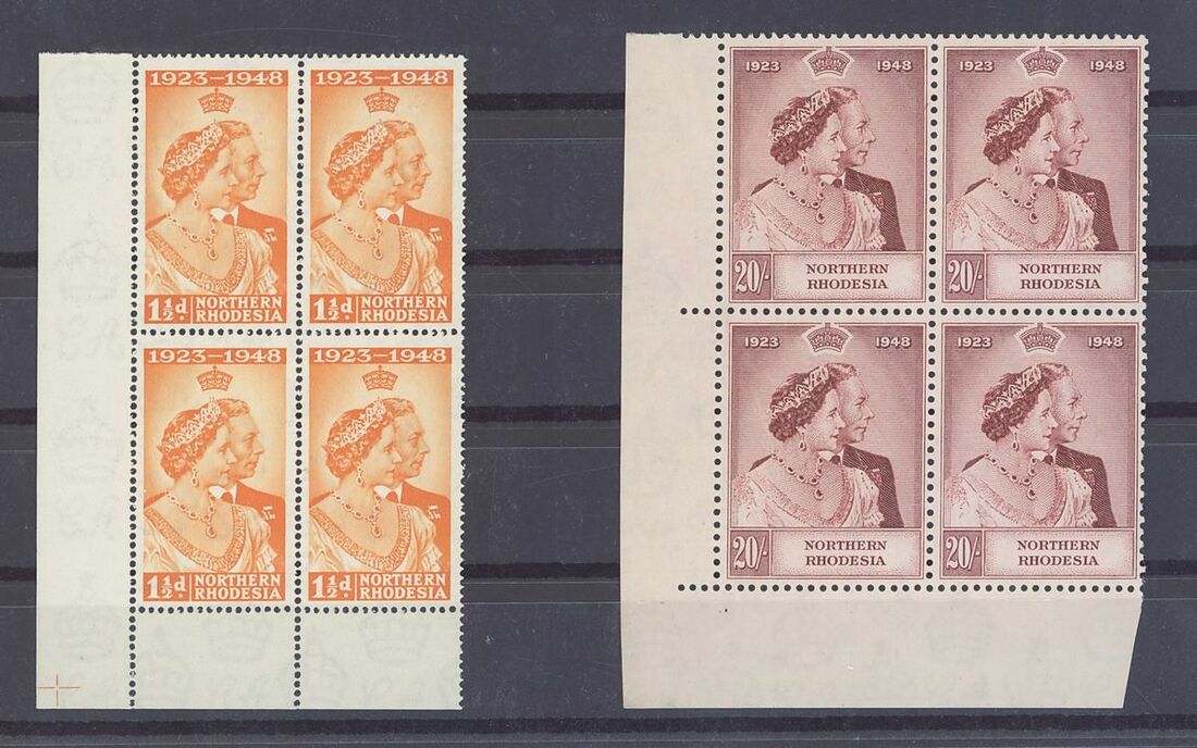 1948 Royal Silver Wedding 1½d. and 20/-, both in lower left corner blocks of four unmounted mint, fine. S.G. 48-49, £480