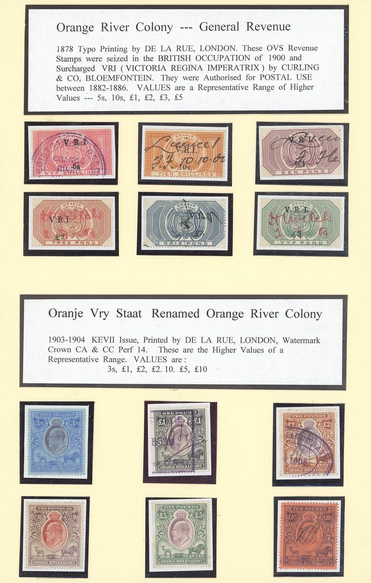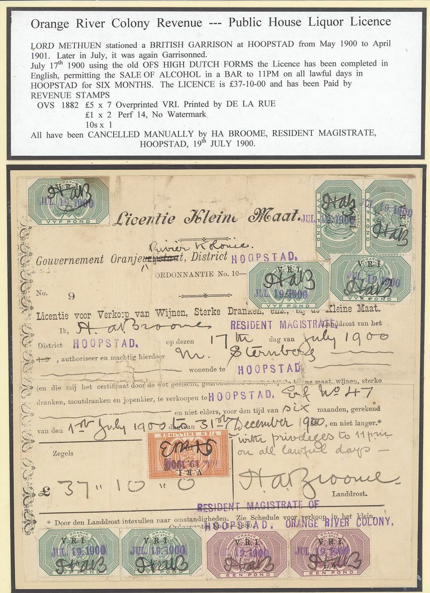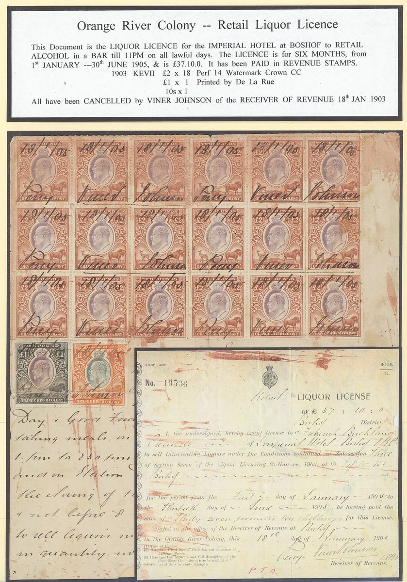 1900 V.R.I. 5/- to £5 used, 1903 3/- unused (crease), £1, £2, £2.10, £5 and £10 used, 1895 Transport Act paid with 1878-82 6d. and £3 pair (tear), 1900 Public House Liquor Licence paid with 1900 10/-, £1 (2), £5 (7), 1905 Retail Liquor Licence paid with 1903 10/-, £1 and £2 block of eighteen (6x3) all with pen cancel of Viner Johnson (filing creases through a few stamps). Written up on display pages, mixed condition though a good group.