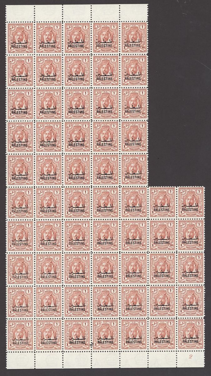 1948 overprinted with Type 1 1m. red-brown part sheet of sixty with sheet number '2', unmounted mint, 1948 overprinted with Type 2 20m. olive-green perf. 12 corner marginal block of twelve with sheet number '1', unmounted mint with trivial gum bend and perf. 12 4m. and 20m. singles overprint inverted, both large part original gum. S.G. c.£1,700