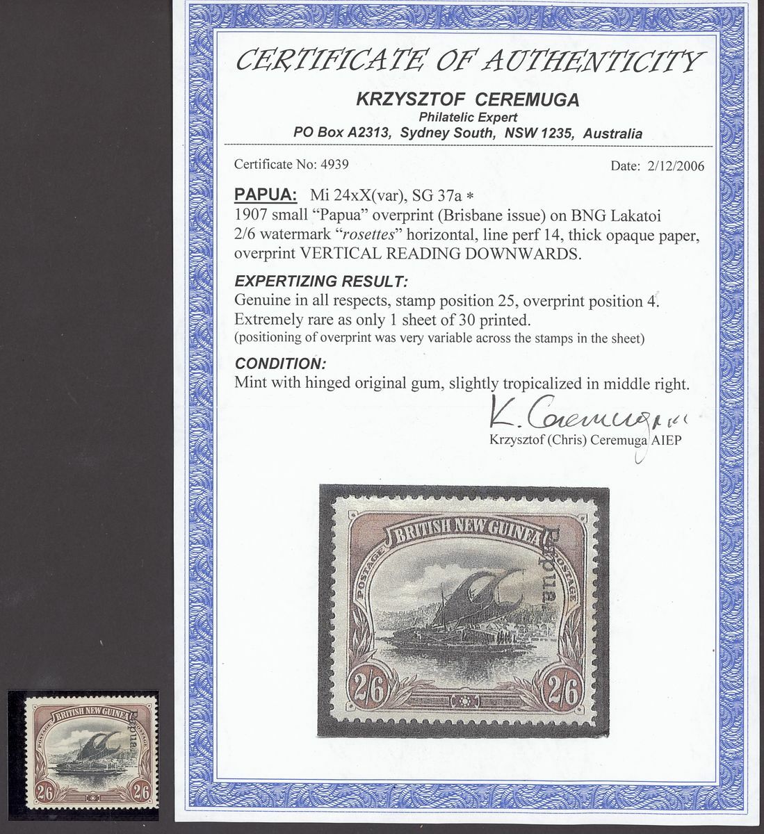 1907 (May - June) Overprinted Small "Papua" at Brisbane, watermark horizontal, 2/6d. black and brown with overprint reading downwards, centred slightly to lower right, unused with large part original gum (small and light patch of toning middle right), fresh and fine appearance. Very rare, only one sheet of thirty printed. Ceremuga Certificate (2006). S.G. 37a, £7,500