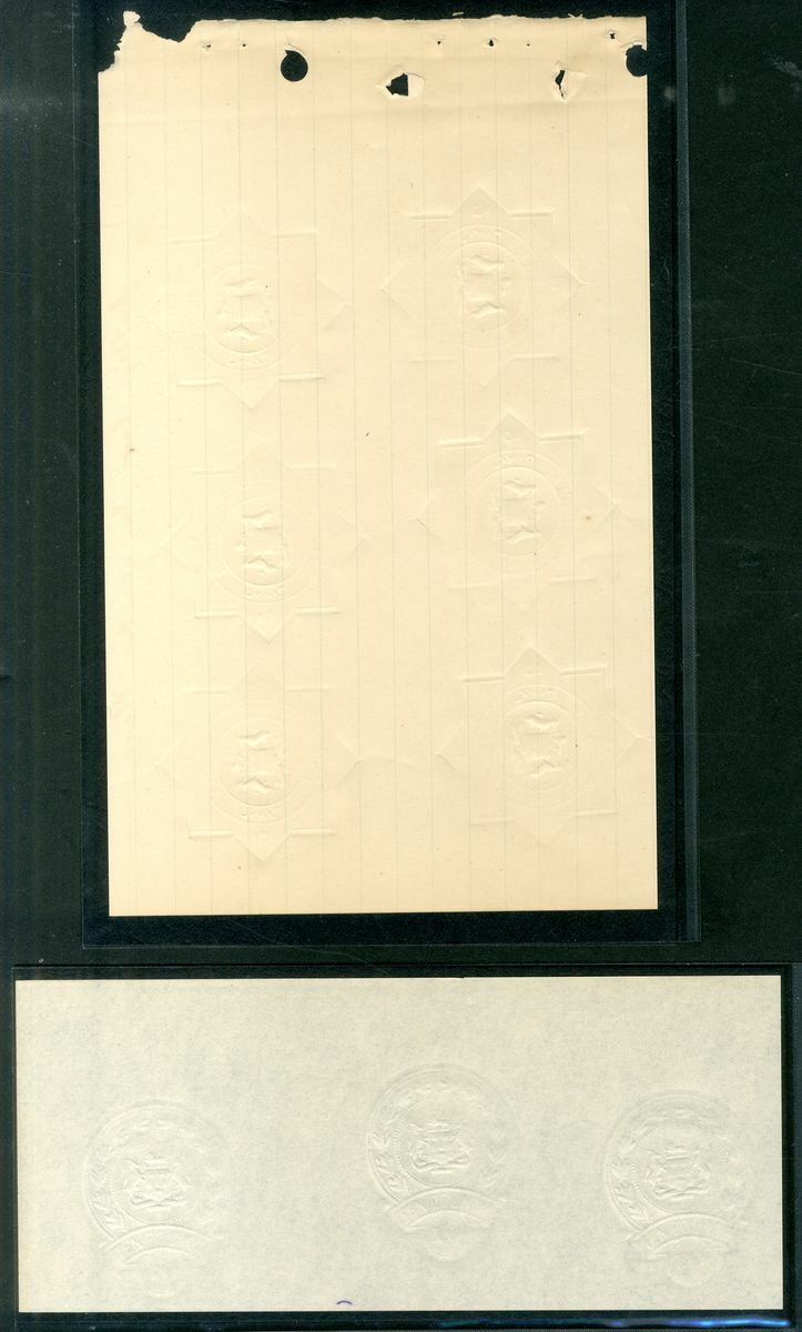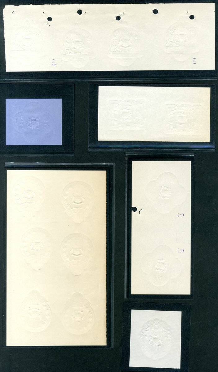1890-1910 British South Africa Company colourless embossing from sample ledger pages arranged on Hagner pages including £1 vertical pair, horizontal strip of four, £2.10 tete-beche vertical pair, £2.10 on blue paper, £3 block of six (2x3) with two vertical tête-bêche, £5, £10 block of six (3x2) with three tête-bêche, £10 horizontal strip of three, a wonderful group, for reference see "Rhodesian Philately to 1924" B. Trotter, C. Hoffman, P. Flanagan .