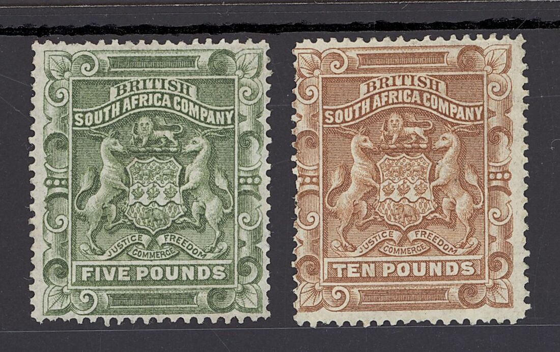 1892-93 Arms £5 sage-green and £10 brown, both regummed and or cleaned otherwise of fresh appearance. S.G. 12, 13
