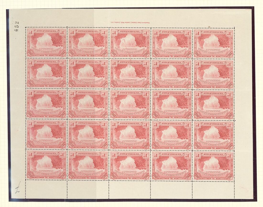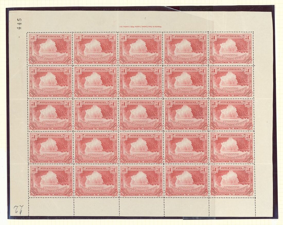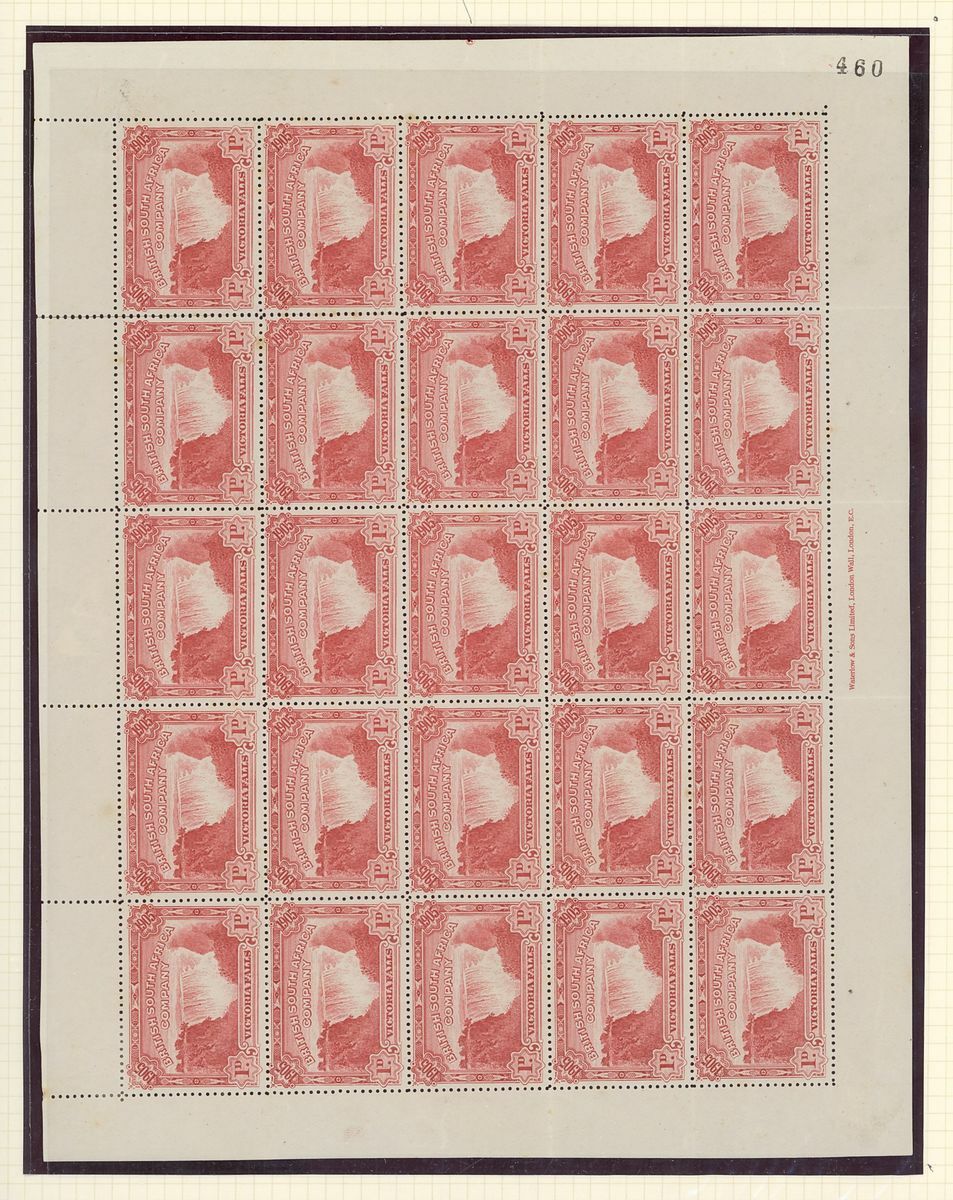 1905 Falls 1d. red complete sheet of twenty-five (4) with sheet number "440", "445", "452" and "460" at lower right corner, [19-20] with "plane" flaw and [23] with "boulder" flaw; fine unmounted mint except the last which has a couple of hinges in margin and some perfs, severed vertically at right