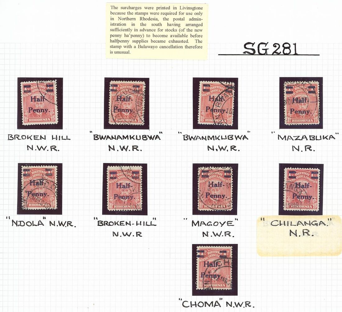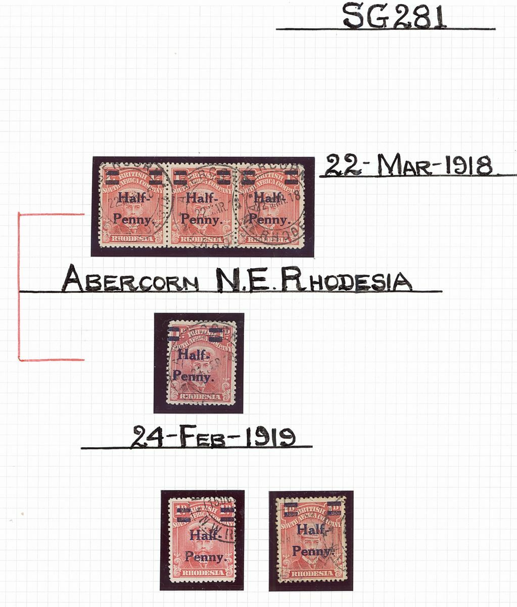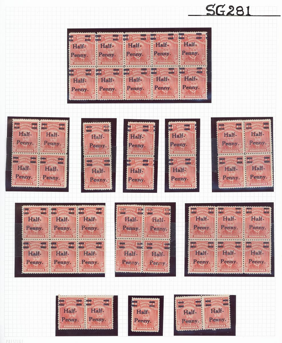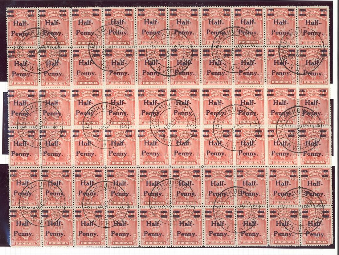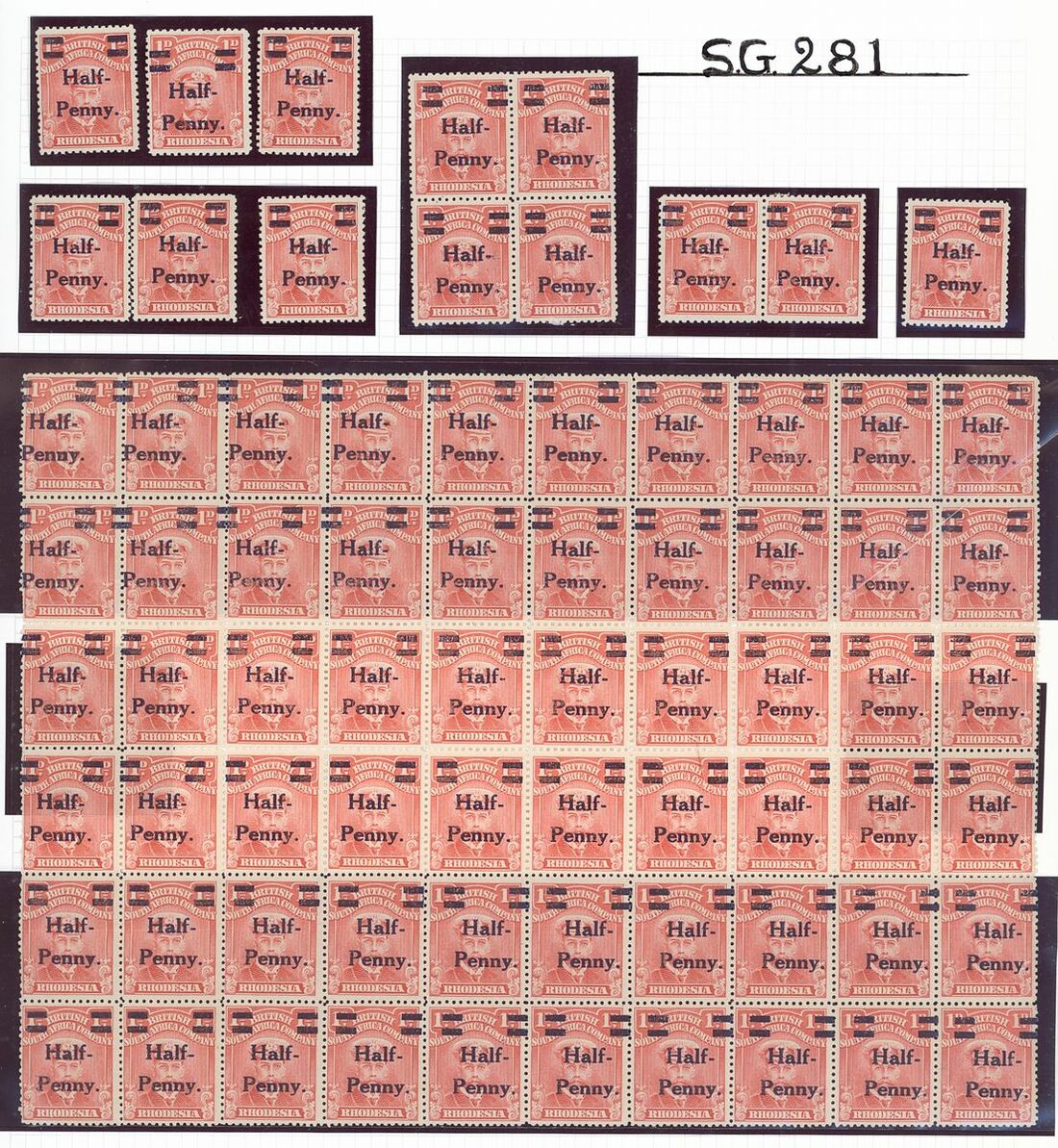 1917 (22 Sept.) "Half-Penny." on 1d. rose-carmine sheet of sixty, blocks of four (4), six and ten (2), pairs (9) and singles (10), mint, sheet of sixty with Bwanamkubwa datestamps, blocks of four (5, one on unaddressed envelope from Bwanamkubwa, a strip of three and singles (13, one with small part Bulawayo datestamp), used. S.G. 281, £1,269+
