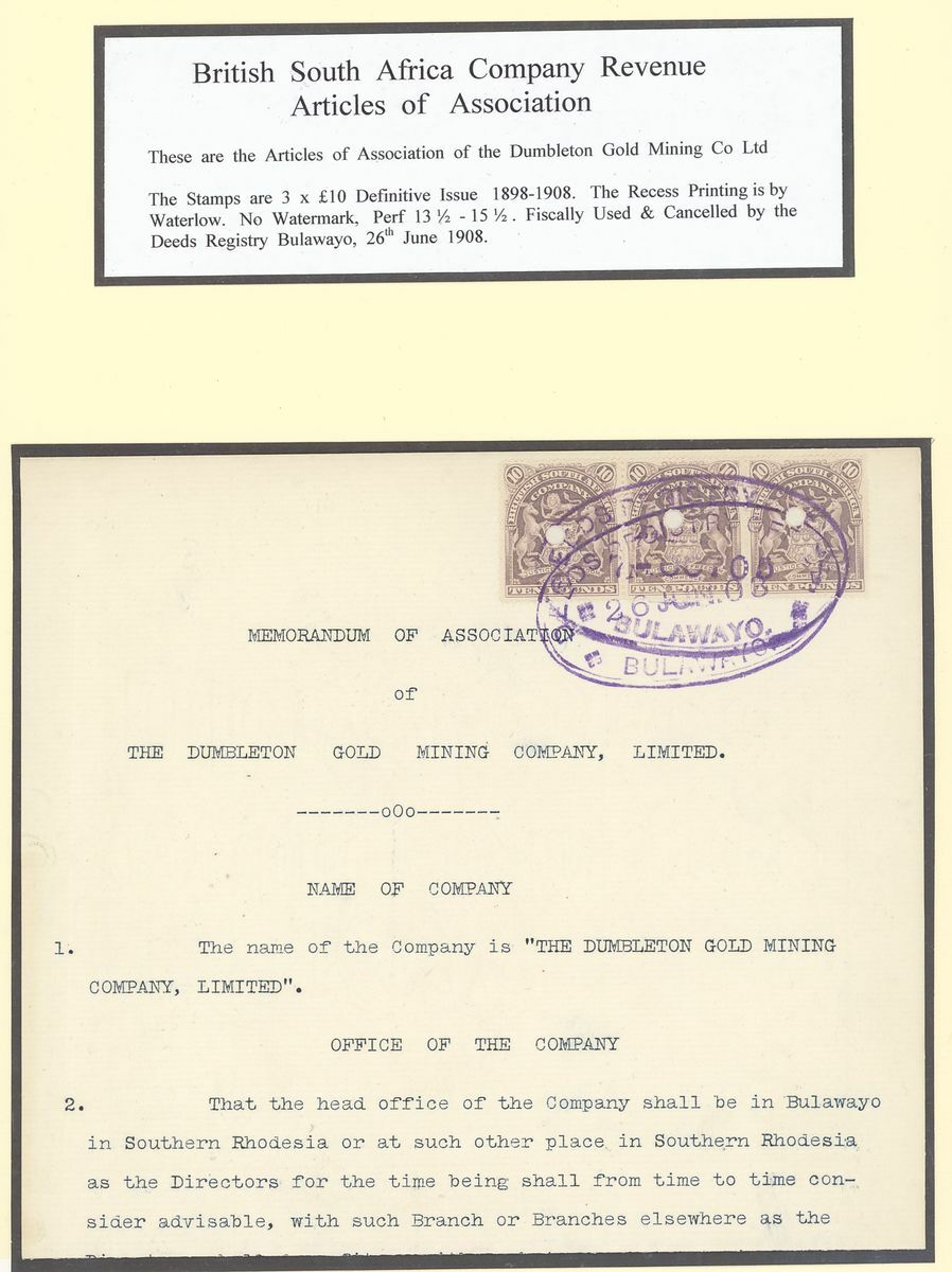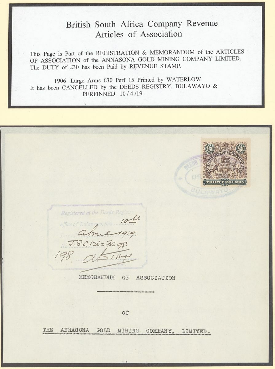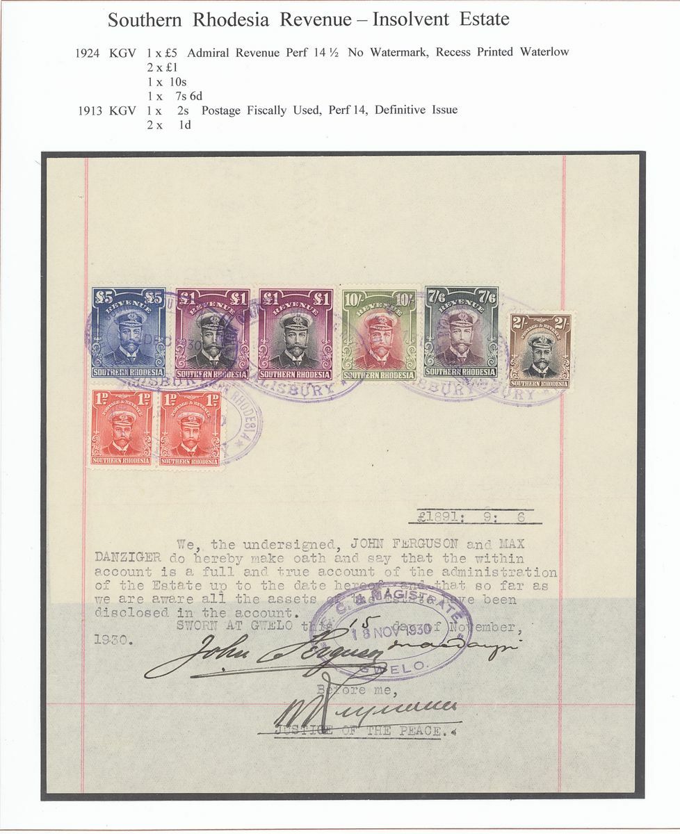 1903-63 a small group written-up on pages for exhibit: 1903 Dubmleton Gold Mining Company document bearing 1898-1908 £10 strip of three, 1906 Deceased Estate document bearing 1892 £1, 1896 2/-, 1898 £1 and £5 all perfin, 1912 and 1918 documents both bearing 1910 £1 (3) in combination with Admirals or Arms issues, 1919 Annasona Gold Mining Company document bearing 1906 £30, 1930 Insolvent Estate bearing Revenue 1913 1d. (2), 2/- and 1924 2/-, 7/6d., 10/-, £1 pair and £5, 1950 Mechanabrick document bearing 1937 £5 (3), £20 (3), 1964 Deed of Hypothecation bearing 1954 £1 and £50 (2). Generally fine and a valuable group