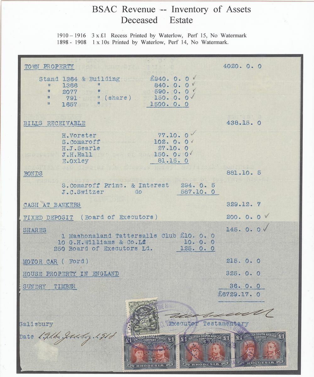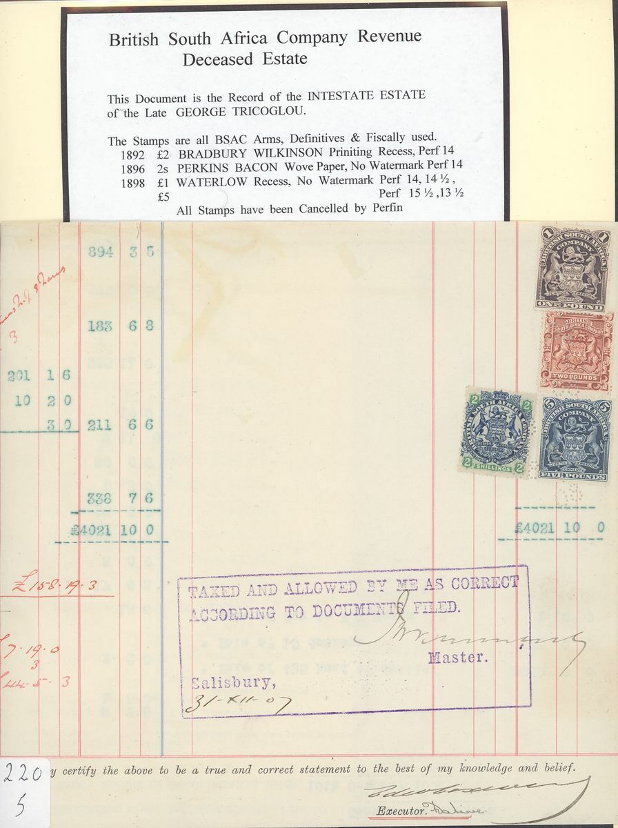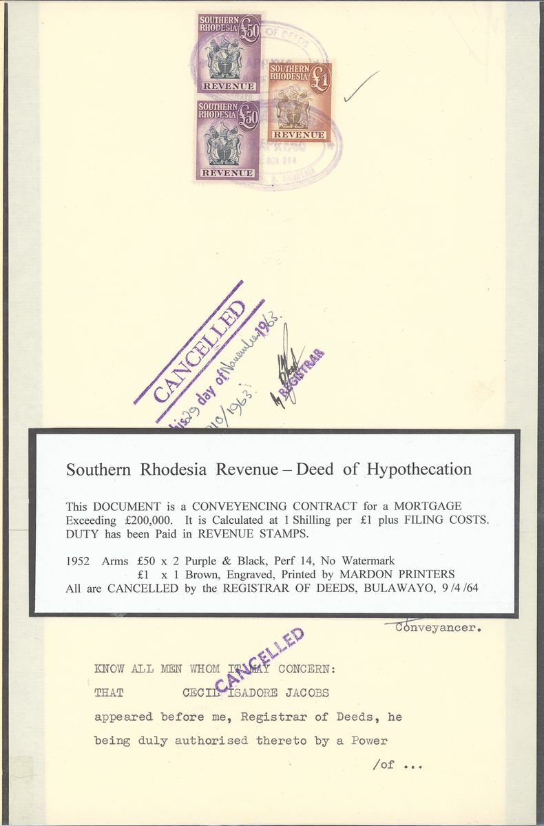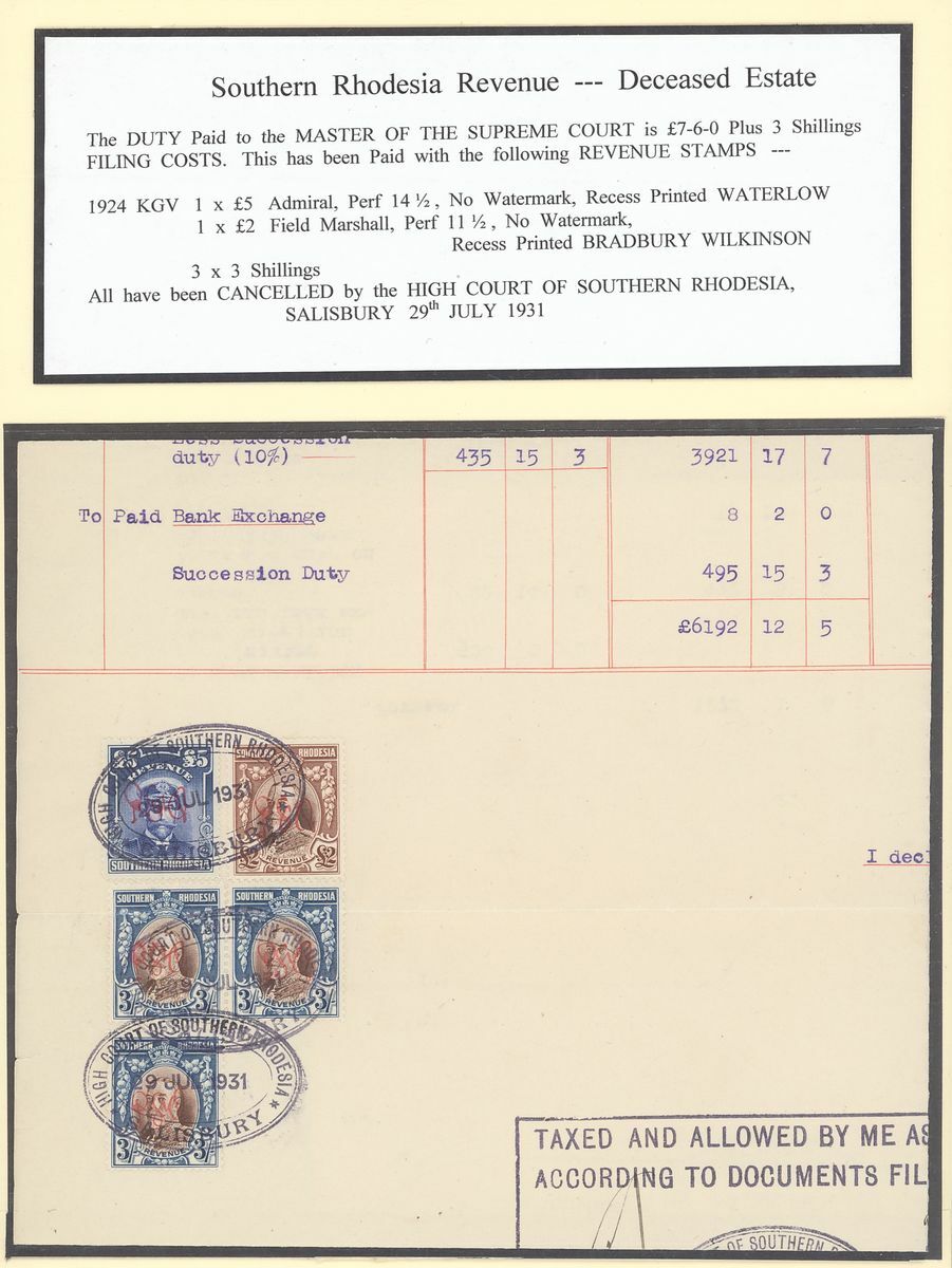 1903-63 a small group written-up on pages for exhibit: 1903 Dubmleton Gold Mining Company document bearing 1898-1908 £10 strip of three, 1906 Deceased Estate document bearing 1892 £1, 1896 2/-, 1898 £1 and £5 all perfin, 1912 and 1918 documents both bearing 1910 £1 (3) in combination with Admirals or Arms issues, 1919 Annasona Gold Mining Company document bearing 1906 £30, 1930 Insolvent Estate bearing Revenue 1913 1d. (2), 2/- and 1924 2/-, 7/6d., 10/-, £1 pair and £5, 1950 Mechanabrick document bearing 1937 £5 (3), £20 (3), 1964 Deed of Hypothecation bearing 1954 £1 and £50 (2). Generally fine and a valuable group