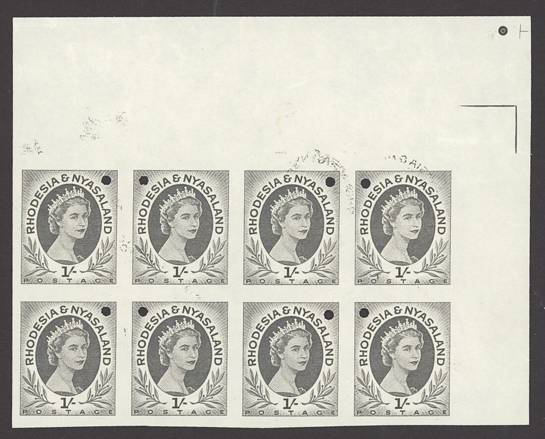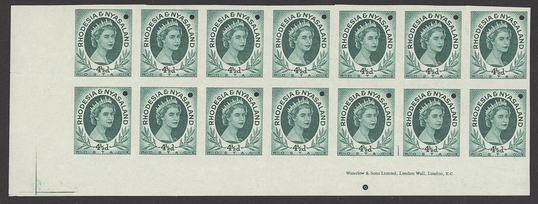 1954 4½d. blue-green Waterlow imperforate file stamps, a lower left corner block of fourteen (7x2) from the foot of the sheet with imprint and 1/- grey-black upper right corner block of eight (4x2), each stamp with small security punch hole; a few minor creases or other small imperfections though generally fine.