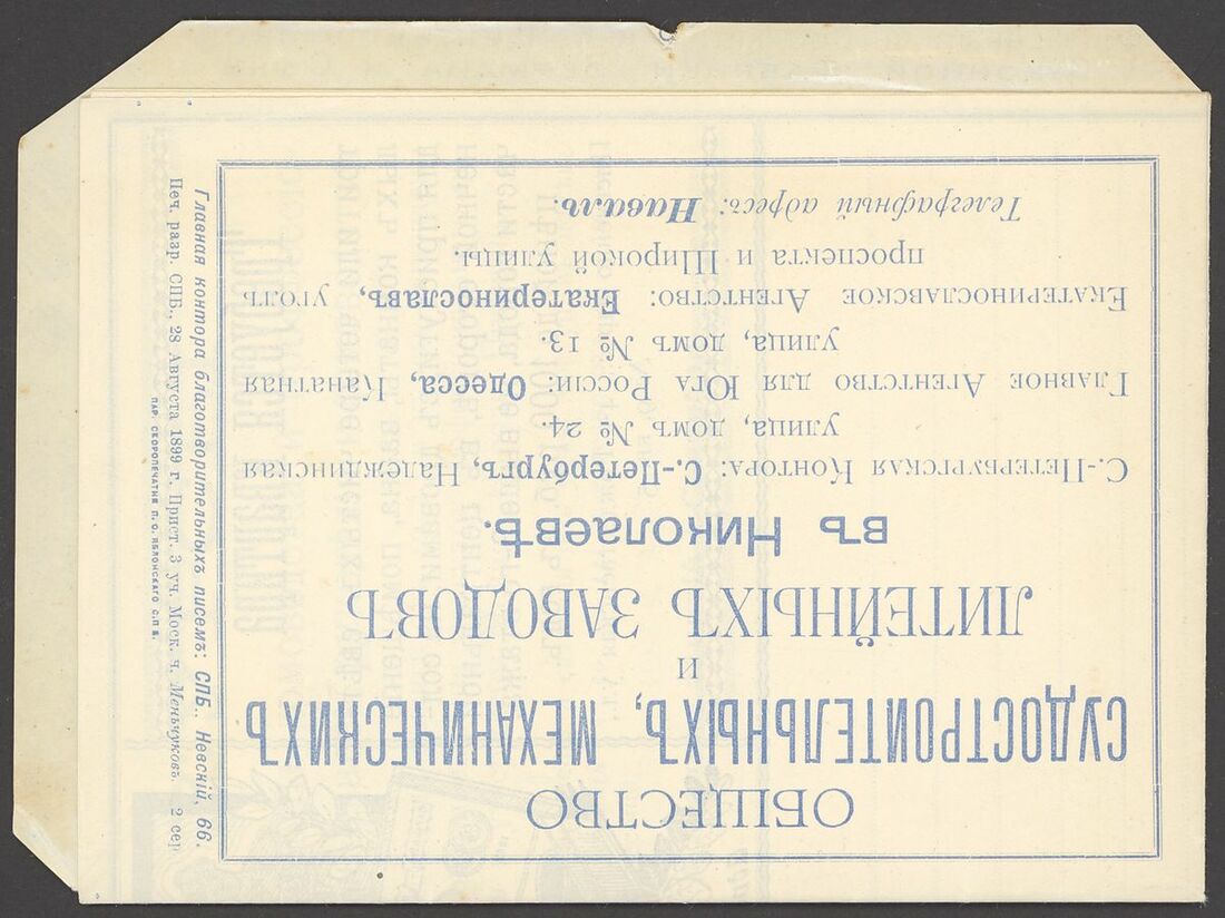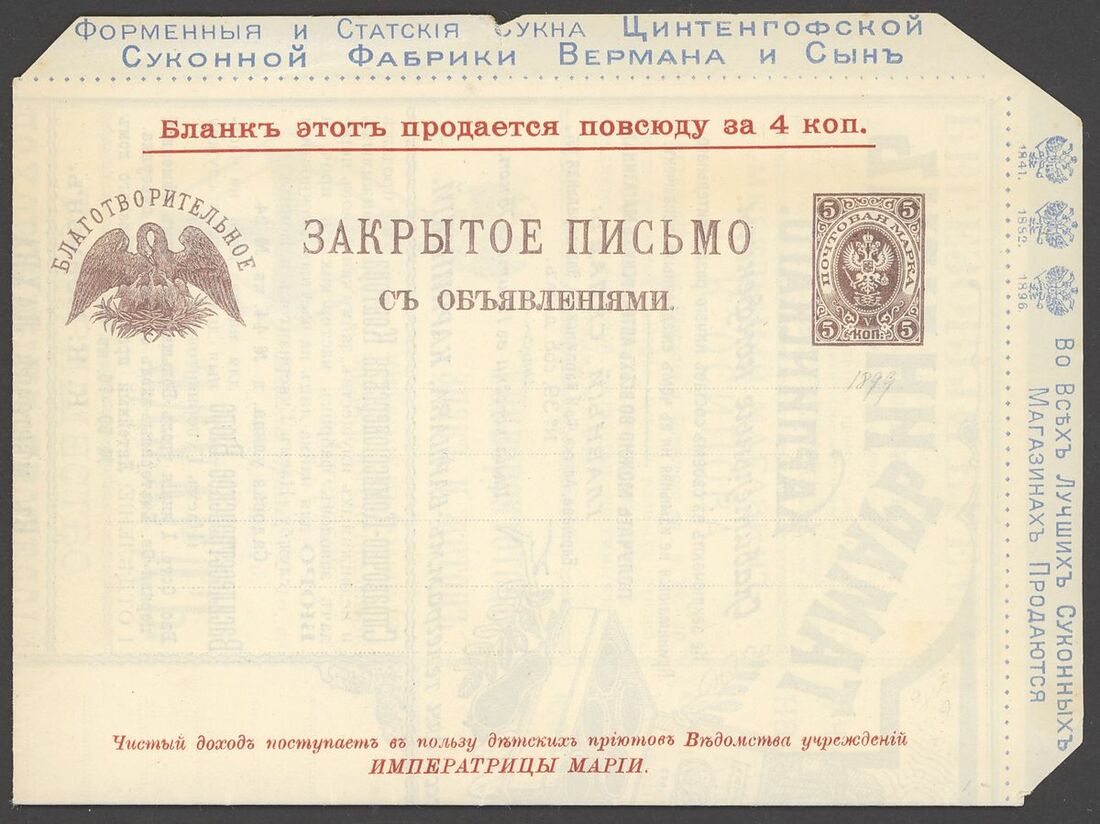 1889-1901 5k. purple-brown postal stationery with adverts from the Maria Feodorovna Foundation, unused, a small tear at top otherwise fine and scarce.