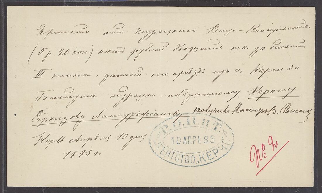 1885 (10 Apr.) handwritten message bearing "ropit/agency kersch" oval handstamp in blue, Kersch was a port at the far east part of Crimea in front of Russia and this handstamp is unrecorded in the Tchilinghirian book, an important discovery!