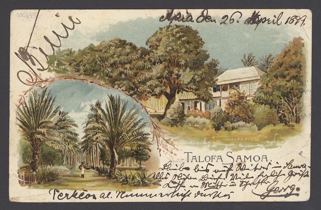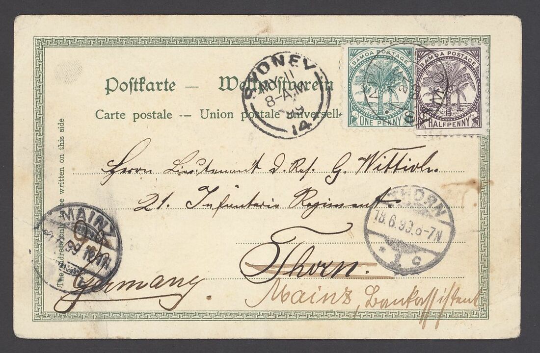 1899 (27 Apr.) postcard bearing Palm Tree ½d. and 1d. cancelled by Apia c.d.s. with year inverted, addressed to Thorn (arrived 18.6) then redirected Mainz (arrived 20.6), few usual faults including creasing not affecting the adhesives, nevertheless a scarce item .