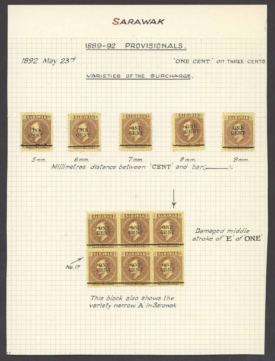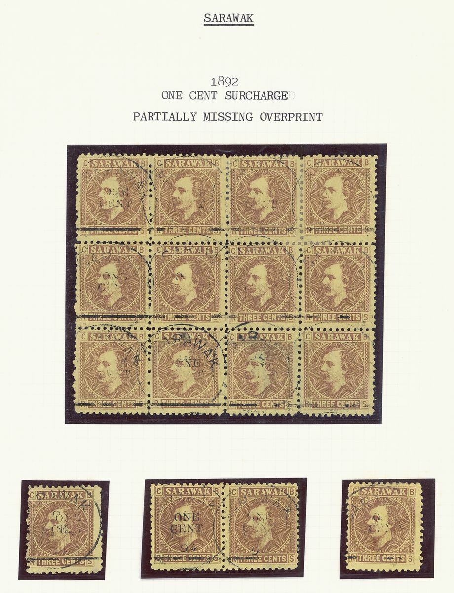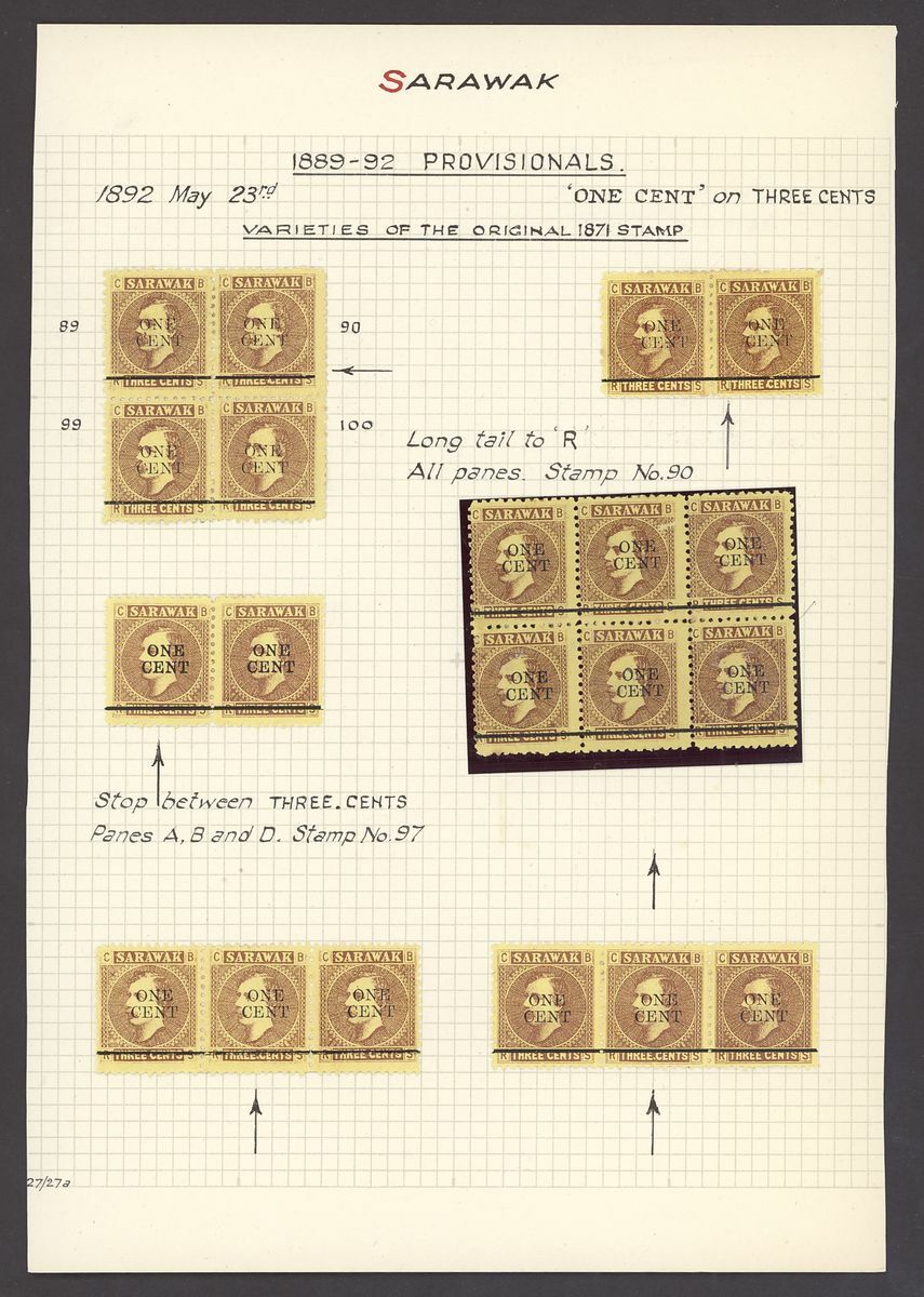 1892 (May) 1c. on 3c. brown on yellow range; the unused comprise marginal block of twenty (10x2), blocks of six (2, one with stop after