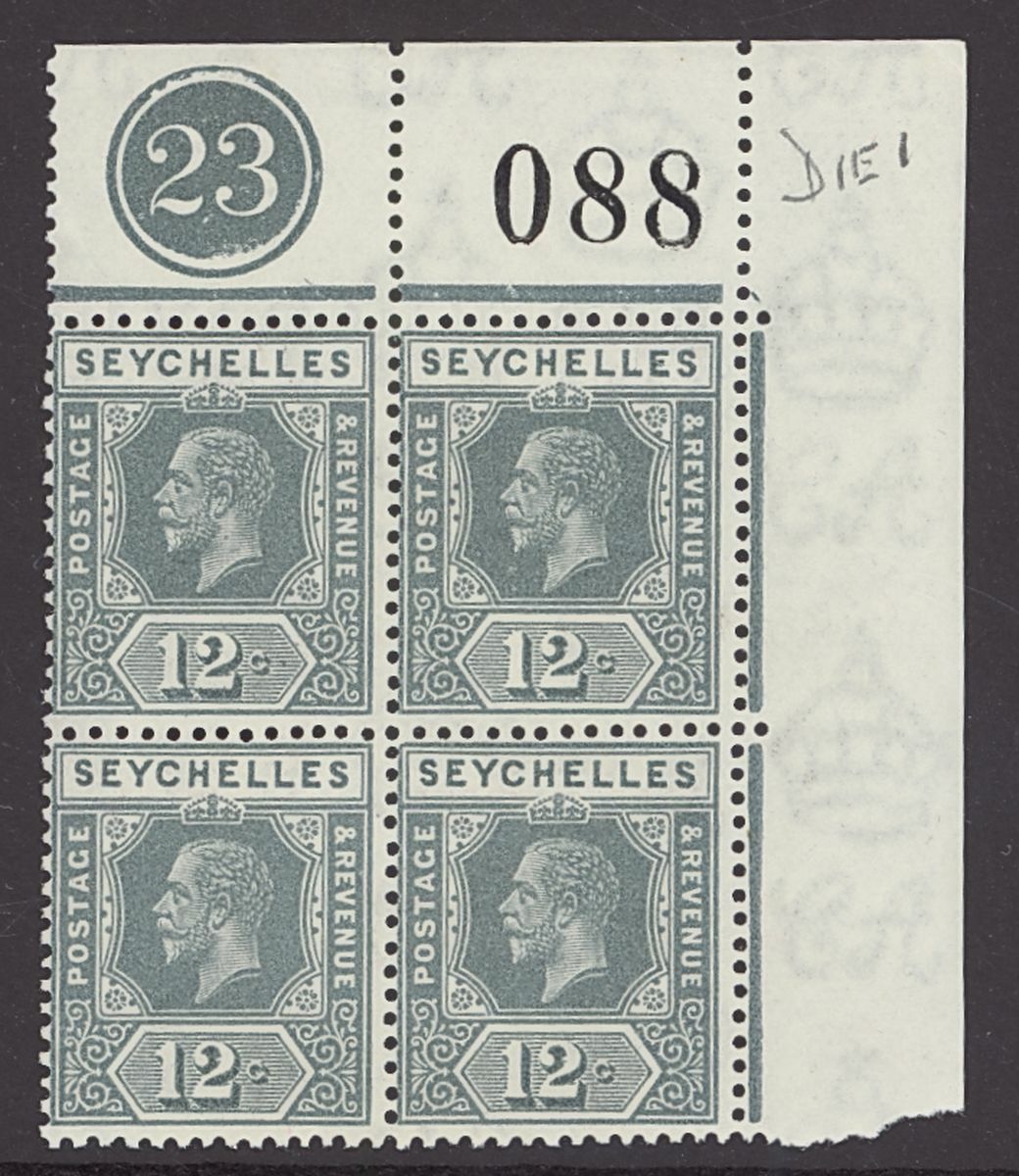 1921-23 12c. grey Die I block of four from the upper right corner with plate number "22" and sheet number "088", unmounted mint, fine and desirable. S.G. 107a, £120+