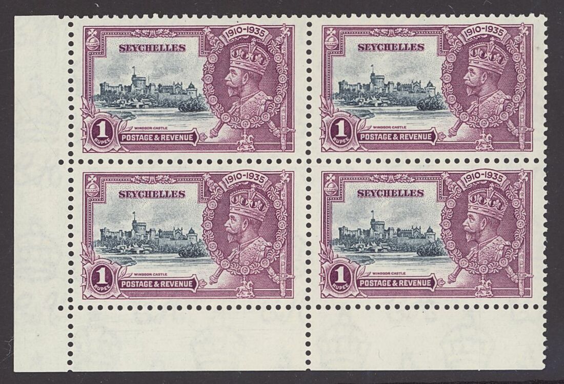 1935 Jubilee 1r. slate and purple lower left corner block of four containing extra flagstaff, mint large part original gum, fresh and very fine. S.G. 131a, £230+